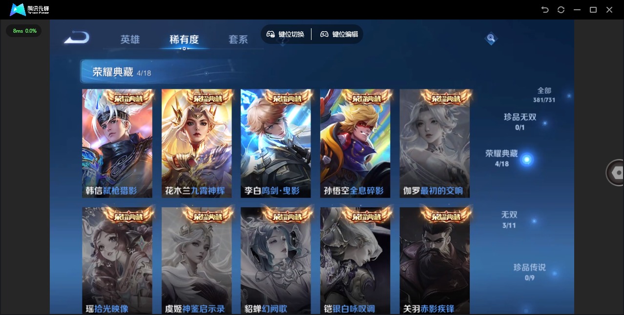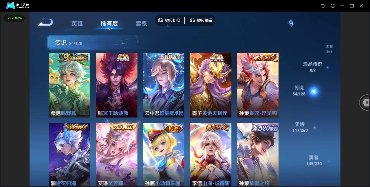 - PX_2095368-88 安卓QQ/尊贵铂金/53皮肤/75英雄/0典藏/0珍品无双/0无双/0珍品传说/5传说/8史诗/6稀有英雄 【5 传说皮肤】久胜战神 干将莫邪,愿照·九州拓 澜,幻光神枪 云缨,愿照·岁时盈 虞姬,鸣野蒿 桑启, 【8 史诗皮肤】魅力维加斯 妲己,鹰眼统帅 狄仁杰,特工魅影 百里守约,猫狗日记 孙策,皇家上将 赵云,圣诞狂欢 吕布,蔷薇恋人 孙尚香,心灵骇客 安琪拉,