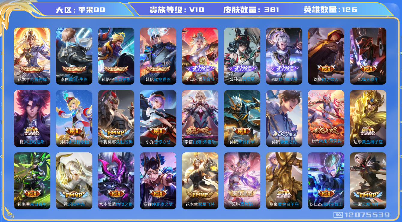 [12075539]V10 4典藏 3无双 34传说 126英雄 381皮肤 典藏英雄武则天 牛魔小国标 可修改实名 优质装备:鸣剑·曳影,全息碎影(猴子典藏),九霄神辉(木兰典藏),弑枪猎影(韩信典藏),韩信群星魔术团(韩信无双),花合斗,离恨烟(公孙离无双),黄金狮子座,冠军飞将,云鹰飞将(小将军),绛天战甲(鸡嘴战神),黄金白羊座,久胜战神,炽阳神光,末日机甲-孙尚香(绿蚂蚱),地狱火,仲夏夜之梦(大飞蛾),音你心动-小乔,地狱之眼,胖达荣荣,时之恋人-刘备(电焊工),超时空战士-狄仁杰,末日机甲-孙策,挚爱之约,山海·炽霜斩(李信年限),小动物乐团,澜逐花归海,艾琳觅芳踪,黄金天蝎座,云中君群星魔术团,涂山容容 传说皮:乘龙·淬吴钩(孙策年限),铠冥王哈迪斯 珍宝阁皮:女武神,玩趣恶龙 限定皮:鸣野蒿,至尊宝,白虎志(电光耗子),凤求凰(白切鸡),太华(伽罗年限),异界灵契(白毛香),时之彼端,魔法小厨娘,时雨天司(水龙头),神威(电光马子),飞衡(韩信年限),降魔,五谷丰年,冰锋战神,御风骁将(吕布年限),虎魄,李小龙,玄武志(苏烈年限),朱雀志(守约年限),如梦令-后羿,霸王别姬-虞姬,孙行者,大圣娶亲,天魔缭乱,冰霜恋舞曲,寅虎·赤拳(老虎年限),山海·玄木吟(马可年限) 史诗皮:灵蛊蚀心,星界战将,龙之律动,怒海争锋,撼地雄心,破空之剑,战舞者,东方月初,芈月浮光幕影,海诺心动手记,琥珀纪元伽罗,决胜骁骑,上官婉儿群星魔术团,蔬乡物语(鲁班七号),乘龙·聚宝船(安琪拉年限),百相守梦-百里守约,百相守梦-黄忠,紫霞仙子,电玩小子(小书包),白龙吟,黄金分割率,特工魅影,千年之狐,永昼,江河有灵,匿光侦查者,真我赫兹(百里守约),魅语,百解令(蒙犽),高渐离燃音魔法,蒙恬荣光圣徽,无限星赏官,偶像歌手,晚萤,龙骑士(小龙虾),末日机甲-吕布,猫狗日记-孙策,猫狗日记-大乔,时之恋人-孙尚香,乱世虎臣,节奏热浪,修罗,女仆咖啡,摇滚巨星,水果甜心,绅士熊喵,天才门将,星夜王子,心灵骇客,时之奇旅-安琪拉,功夫厨神,德古拉伯爵,暗隐猎兽者,幽灵船长,鬼剑武藏,暗渊魔法,心灵战警,乐园奇幻夜,天秀·启明,舞动绿茵,地狱岩魂,纤云弄巧,繁星吟游(呼啦呼啦),拒霜思,缤纷独角兽,乘风破浪,逐浪之夏,月团寄思,水晶猎龙者,曙光守护者,箭羽风息,金属风暴,原初追逐者,圣诞狂欢,