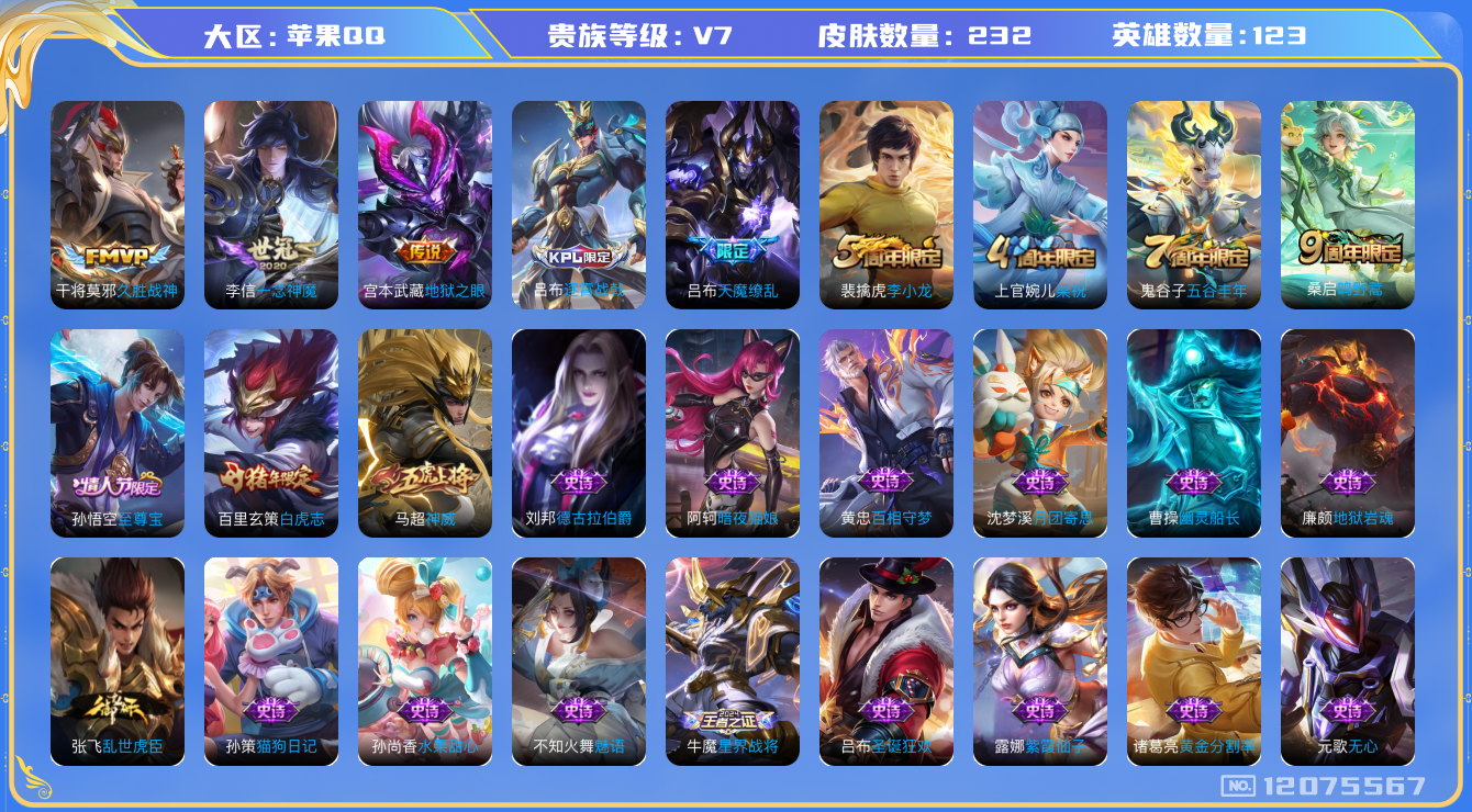[12075567]V7 6传说 123英雄 232皮肤 可修改实名 优质装备:久胜战神,一念神魔,地狱之眼,涂山容容 珍宝阁皮:优雅恋人,蔷薇恋人 限定皮:逐霄战戟,鸣野蒿,至尊宝,白虎志(电光耗子),神威(电光马子),五谷丰年,梁祝,李小龙,天魔缭乱 史诗皮:星界战将,谪仙醉月,龙之律动,百相守梦-黄忠,紫霞仙子,黄金分割率,千年之狐,永昼,魅语,百解令(蒙犽),蒙恬荣光圣徽,无限星赏官,暗夜猫娘,龙骑士(小龙虾),猫狗日记-孙策,乱世虎臣,修罗,水果甜心,星夜王子,功夫厨神,德古拉伯爵,暗隐猎兽者,幽灵船长,鬼剑武藏,心灵战警,地狱岩魂,纤云弄巧,繁星吟游(呼啦呼啦),拒霜思,月团寄思,水晶猎龙者,金属风暴,原初追逐者,圣诞狂欢,鹰眼统帅,魅力维加斯,黎明之约,无心