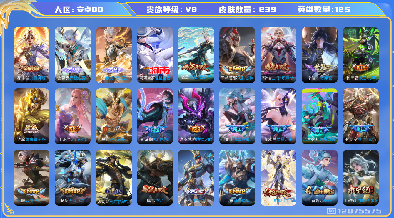 [12075575]V8 1典藏 2无双 1珍品传说 22传说 125英雄 239皮肤 可修改实名 优质装备:九霄神辉(木兰典藏),器灵·螭龙剑,天机白泽,怪盗基德,黄金狮子座,云鹰飞将(小将军),久胜战神,一念神魔,末日机甲-孙尚香(绿蚂蚱),零号·赤焰,地狱之眼,乞巧织情,无双飞将,山海·炽霜斩(李信年限),燃星之曲,妄想奇谈,遇见神鼓,涂山容容 传说皮:乘龙·铭钟鼎(赵云年限),落雪白狼,死亡执政官,九山相柳 珍宝阁皮:胡桃夹子 限定皮:愿照·山河定(司空震年限),逐霄战戟,鸣野蒿,至尊宝,傲雪梅枪,怒海麟威,降魔,梁祝,岱宗(典韦年限),永曜之星,神器·万象笔 史诗皮:鸭鸭历险记-刘禅,化蝶舞,星界战将,谪仙醉月,龙之律动,雪豹·霜爪,藏狐·褐绒,石田雨龙,百相守梦-周瑜,茶境仙,怒海争锋,破空之剑,琥珀纪元伽罗,蔬乡物语(鲁班七号),百相守梦-百里守约,星界特工,百相守梦-黄忠,织梦人,守夜人,白龙吟,黄金分割率,特工魅影,千年之狐,永昼,江河有灵,真我赫兹(百里守约),魅语,百解令(蒙犽),高渐离燃音魔法,蒙恬荣光圣徽,偶像歌手,电玩·爆裂旋风,百相守梦(关羽),末日机甲-吕布,猫狗日记-孙策,乱世虎臣,节奏热浪,修罗,女仆咖啡,摇滚巨星,水果甜心,天才门将,功夫厨神,暗隐猎兽者,幽灵船长,鬼剑武藏,暗渊魔法,心灵战警,天秀·启明,地狱岩魂,纤云弄巧,拒霜思,缤纷独角兽,逐浪之夏,月团寄思,水晶猎龙者,曙光守护者,唤灵魅影,金属风暴,圣诞狂欢,圣诞恋歌,鹰眼统帅,暗夜贵公子,魅力维加斯,黎明之约,雪上飞焰,未来纪元-赵云