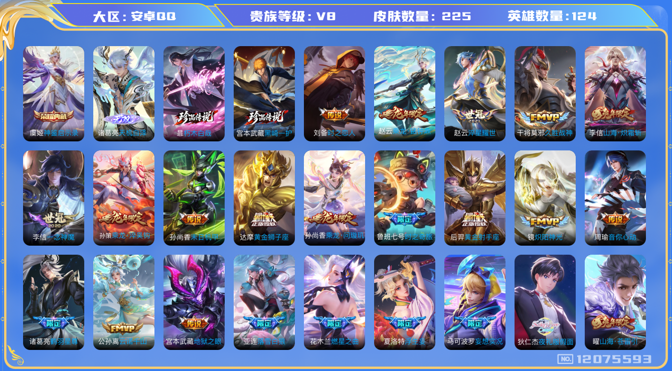- [11297518]V8 1典藏 12传说 125英雄 349皮肤 可修改实名 优质装备:鸣剑·曳影,黄金狮子座,黄金射手座,冠军飞将,云鹰飞将(小将军),地狱火,零号·赤焰,李逍遥,澜逐花归海 珍宝阁皮:万物之道,优雅恋人,玩趣恶龙 限定皮:鸣野蒿,白虎志(电光耗子),傲雪梅枪,瑞麟志(木兰年限),高山流水,五谷丰年,青龙志(铠年限),冰锋战神,武圣,梁祝,李小龙,逐梦之影,玄武志(苏烈年限),朱雀志(守约年限),霸王别姬-项羽,默契交锋-花木兰,猪悟能,一生所爱,大圣娶亲,青春决赛季,冰霜恋舞曲,蜜橘之夏,寅虎·心曲(虎婆) 史诗皮:星界战将,龙之律动,蔬乡物语(鲁班七号),超元猎域,百相守梦-黄忠,紫霞仙子,苍穹之光,白龙吟,黄金分割率,特工魅影,电玩·爆裂旋风,百解令(蒙犽),蒙恬荣光圣徽,偶像歌手,暗夜猫娘,末日机甲-吕布,猫狗日记-孙策,乱世虎臣,节奏热浪,修罗,女仆咖啡,摇滚巨星,水果甜心,绅士熊喵,天才门将,星夜王子,心灵骇客,功夫厨神,德古拉伯爵,暗隐猎兽者,幽灵船长,鬼剑武藏,暗渊魔法,心灵战警,天秀·启明,地狱岩魂,纤云弄巧,繁星吟游(呼啦呼啦),拒霜思,缤纷独角兽,乘风破浪,逐浪之夏,水晶猎龙者,曙光守护者,热力回旋,金属风暴,原初追逐者,圣诞狂欢,圣诞恋歌,鹰眼统帅,暗夜贵公子,魅力维加斯,黎明之约,无心,未来纪元-赵云
