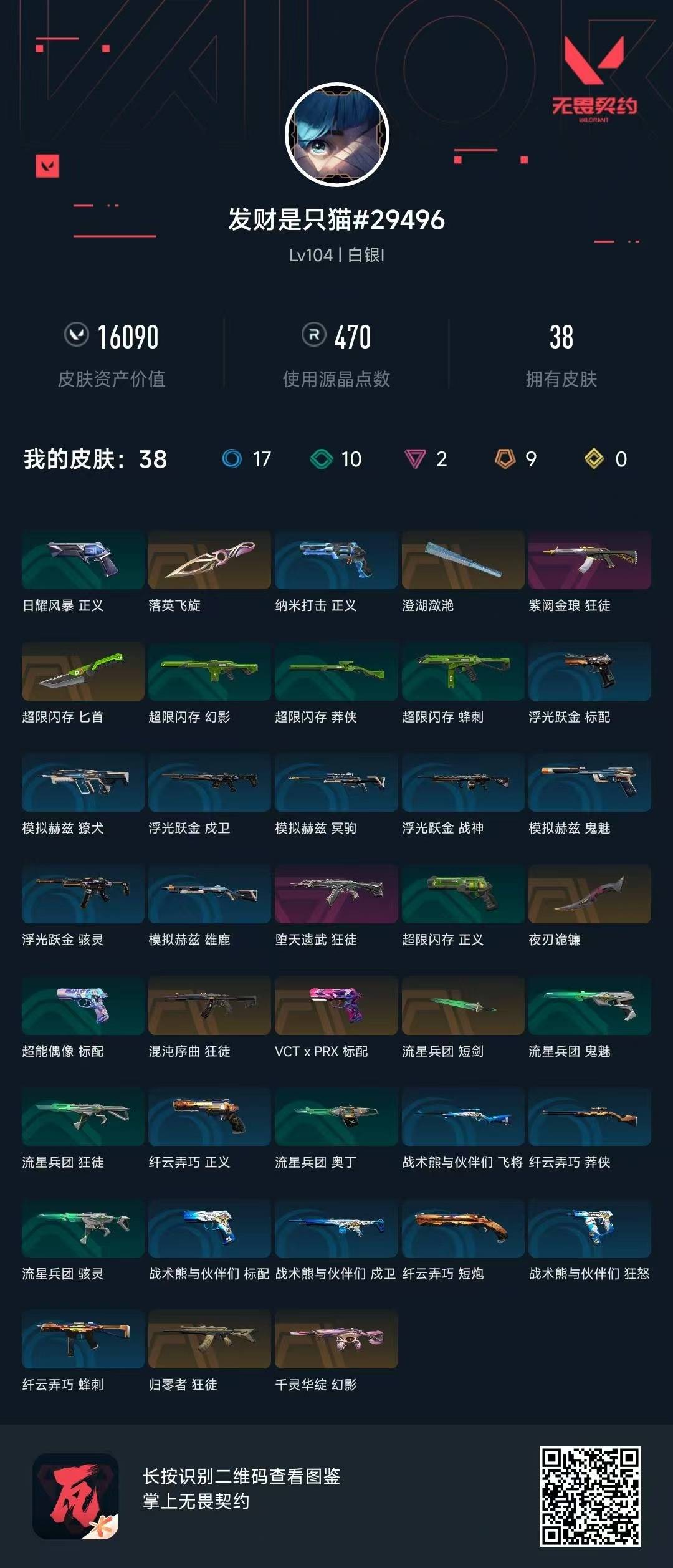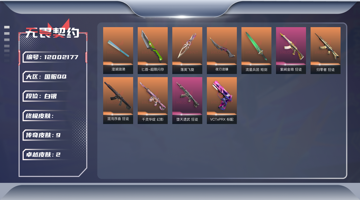 [12002177]9橙皮 2紫皮 38皮肤 27英雄 78卡面 470已用源晶 白银 优质装备:狂徒-归零者,幻影-千灵华绽,狂徒-混沌序曲,狂徒-紫阙金琅,澄湖潋滟,落英飞旋,夜刃诡镰,匕首-超限闪存 佩枪皮肤:标配-VCTxPRX 步枪皮肤:狂徒-堕天遗武 近战武器皮肤:短剑-流星兵团