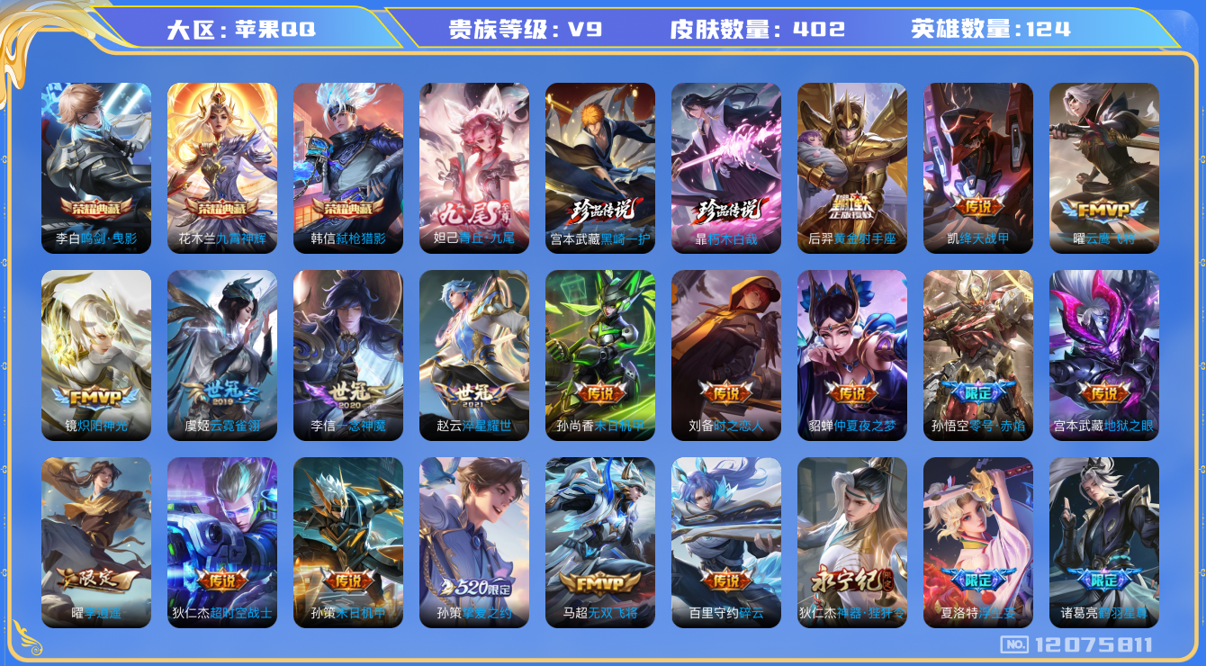 [12075811]【商品标题】:苹果Q-V9-最强王者段位-124英雄-402皮肤-3典藏-0珍品无双-1无双-2珍品传说-44传说-117史诗