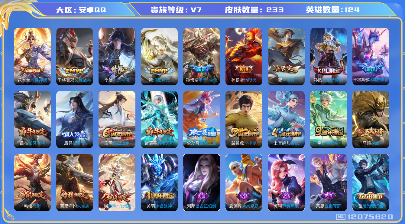 [12075820]V7 1典藏 9传说 124英雄 233皮肤 可修改实名 优质装备:九霄神辉(木兰典藏),久胜战神,炽阳神光,一念神魔,地狱火,零号·赤焰,李逍遥,涂山容容 珍宝阁皮:女武神,玩趣恶龙 限定皮:愿照·九州拓(澜年限),鸣野蒿,时雨天司(水龙头),神威(电光马子),飞衡(韩信年限),高山流水,冰锋战神,天狼运算者,梁祝,御风骁将(吕布年限),李小龙,朱雀志(守约年限),如梦令-后羿,冰霜恋舞曲,蜜橘之夏 史诗皮:器灵·浮梦炉,龙之律动,百相守梦-周瑜,百相守梦-黄忠,苍穹之光,白龙吟,黄金分割率,特工魅影,千年之狐,百解令(蒙犽),偶像歌手,乱世虎臣,节奏热浪,修罗,女仆咖啡,水果甜心,星夜王子,心灵骇客,功夫厨神,德古拉伯爵,幽灵船长,鬼剑武藏,舞动绿茵,地狱岩魂,纤云弄巧,拒霜思,缤纷独角兽,乘风破浪,逐浪之夏,水晶猎龙者,曙光守护者,箭羽风息,金属风暴,原初追逐者,圣诞狂欢,鹰眼统帅,黎明之约,未来纪元-赵云