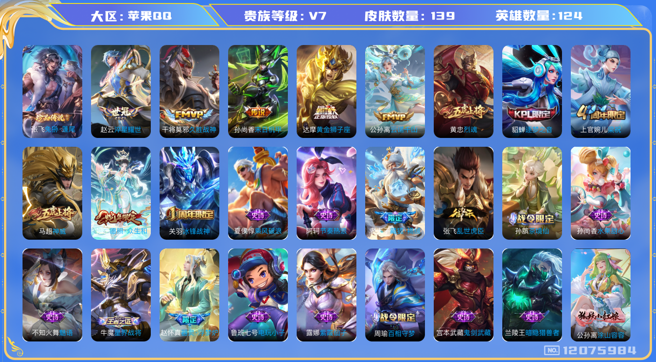 [12075984]V7 1珍品传说 6传说 124英雄 139皮肤 可修改实名 优质装备:黄金狮子座,久胜战神,末日机甲-孙尚香(绿蚂蚱),淬星耀世,涂山容容 珍品传说:兔狲·蓬尾 传说皮:云诺千山 珍宝阁皮:蔷薇恋人 限定皮:愿照·众生和(妲己年限),神威(电光马子),冰锋战神,梁祝,烈魂,逐梦之音 史诗皮:苍鳞隐世,器灵·浮梦炉,瑰影绮梦,灵蛊蚀心,星界战将,龙之律动,藏狐·褐绒,百相守梦-周瑜,茶境仙,星界特工,紫霞仙子,电玩小子(小书包),千年之狐,魅语,蒙恬荣光圣徽,偶像歌手,晚萤,乱世虎臣,节奏热浪,摇滚巨星,水果甜心,心灵骇客,暗隐猎兽者,鬼剑武藏,心灵战警,诗语江南,纤云弄巧,乘风破浪,逐浪之夏,金属风暴,原初追逐者,鹰眼统帅,魅力维加斯,黎明之约