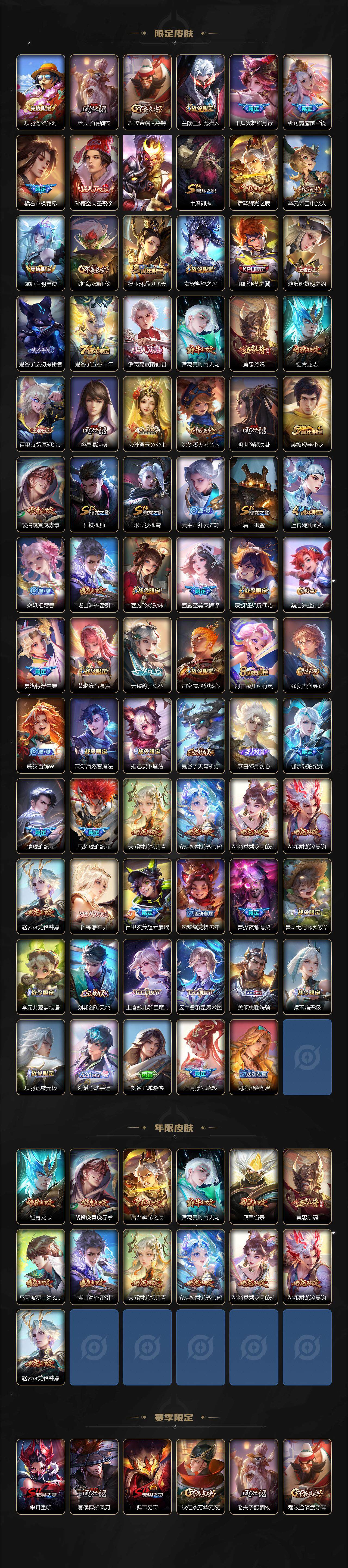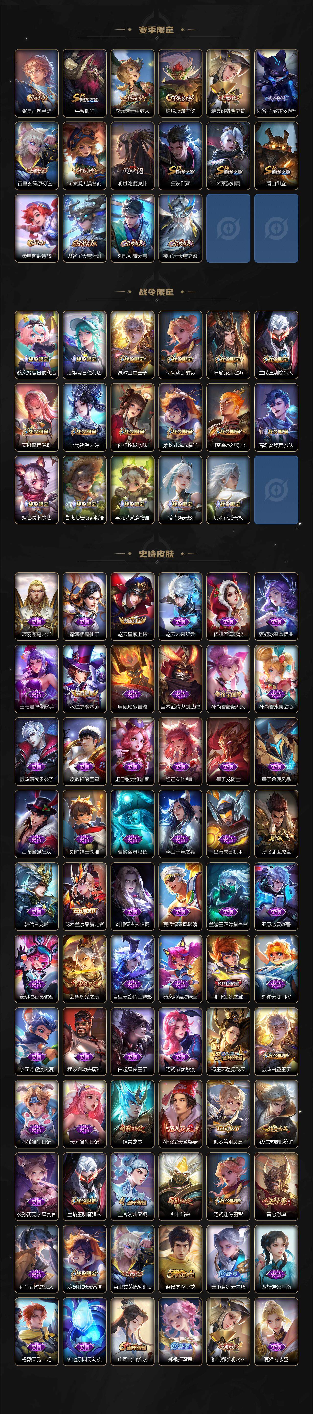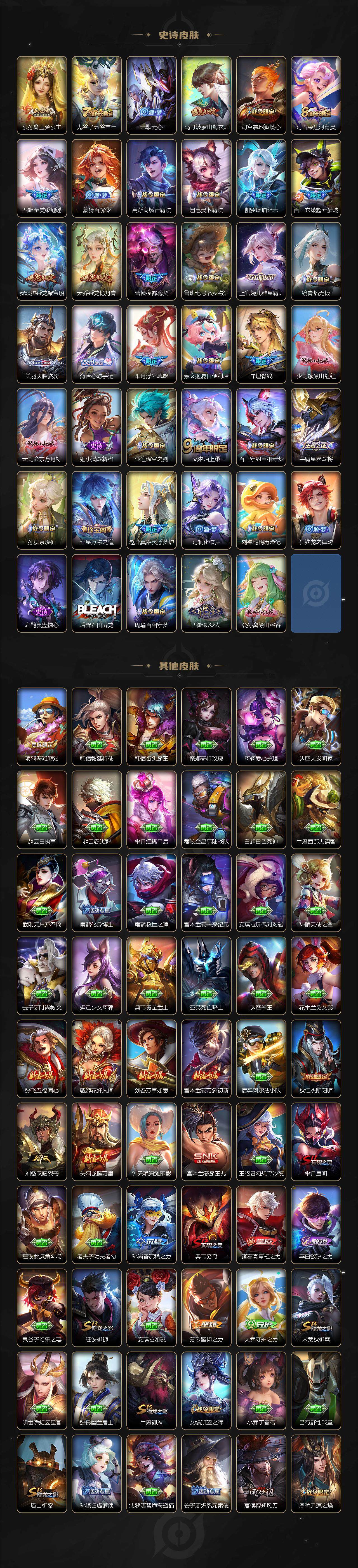 【限定皮肤】:暃埋骨钱,蔡文姬夏日便利店,大乔绒语心约,虞姬夏日便利店,姜子牙天穹之誓,杨戬破阵退雄兵,狄仁杰阴阳师,赵云皇家上将,嬴政白昼王子,孙尚香蔷薇恋人,孙尚香异界灵契,鲁班七号时之奇旅,庄周高山流水,阿轲迷踪丽影,芈月重明,周瑜赤莲之焰,元歌无心,夏侯惇朔风刀,典韦穷奇,典韦岱宗,马可波罗山海玄木吟,狄仁杰魔术师,狄仁杰万华元夜,狄仁杰神器狴犴令,项羽海滩派对,老夫子醍醐杖,程咬金演武夺筹,兰陵王驯魔猎人,不知火舞绯月行,娜可露露前尘镜,橘右京枫霜尽,孙悟空大圣娶亲,孙悟空齐天大圣,牛魔御旌,后羿辉光之辰,李元芳云中旅人,虞姬启明星使,钟馗驱傩正仪,杨玉环遇见飞天,女娲朔望之晖,哪吒逐梦之翼,雅典娜黎明之约,鬼谷子原初探秘者,鬼谷子五谷丰年,诸葛亮武陵仙君,诸葛亮时雨天司,黄忠烈魂,铠青龙志,百里玄策原初追逐者,弈星混沌棋,公孙离玉兔公主,沈梦溪大漠名商,明世隐疑决卦,裴擒虎李小龙,裴擒虎寅虎赤拳,狂铁御狮,米莱狄御霄,云中君纤云弄巧,盾山御銮,上官婉儿梁祝,嫦娥拒霜思,曜山海苍雷引,西施玲珑珍味,西施至美乘鲤谣,蒙犽狂想玩偶