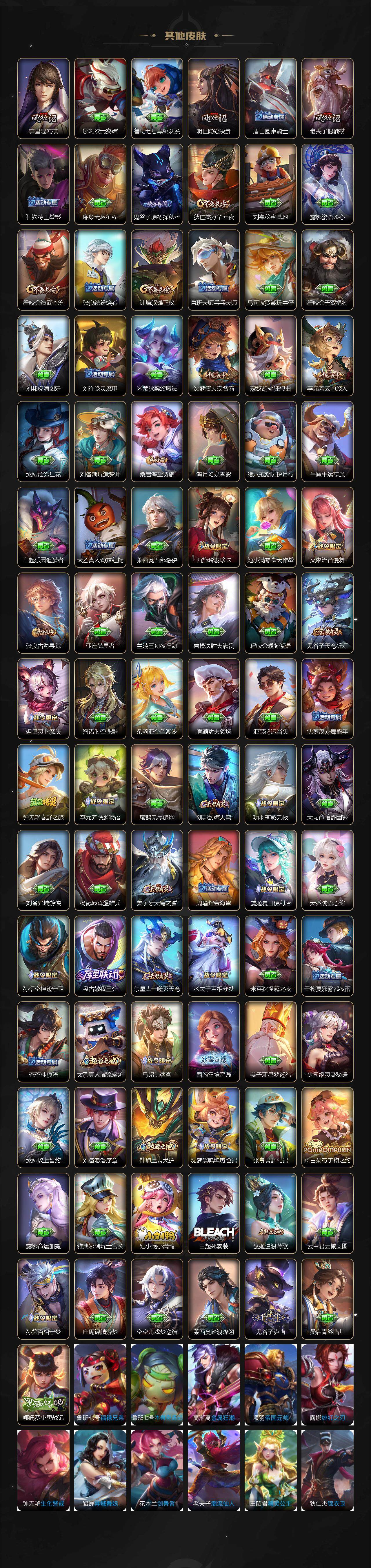 伽罗箭羽风息,李元芳逐浪之夏,公孙离无限星赏官,大乔猫狗日记,孙策猫狗日记,阿轲节奏热浪,露娜紫霞仙子,王昭君偶像歌手,韩信白龙吟,项羽苍穹之光,孙尚香时之恋人,吕布末日机甲,墨子龙骑士,嬴政摇滚巨星,刘禅绅士熊喵,刘禅天才门将,白起星夜王子,安琪拉心灵骇客,程咬金功夫厨神,刘邦德古拉伯爵,兰陵王暗隐猎兽者,曹操幽灵船长,宫本武藏鬼剑武藏,亚瑟心灵战警,钟馗乐园奇幻夜,杨戬天秀·启明,蔡文姬舞动绿茵,廉颇地狱岩魂,西施诗语江南,夏侯惇乘风破浪,花木兰水晶猎龙者,墨子金属风暴,百里玄策原初追逐者,吕布圣诞狂欢,貂蝉圣诞恋歌,百里守约特工魅影,嬴政暗夜贵公子,嫦娥拒霜思,雅典娜黎明之约,李白千年之狐,夏洛特永昼,蒙犽百解令,高渐离燃音魔法,伽罗琥珀纪元,大乔乘龙·忆丹青,安琪拉乘龙·聚宝船,曹操夜都魔契,上官婉儿群星魔术团,关羽决胜骁骑,海诺心动手记,赵怀真器灵·浮梦炉