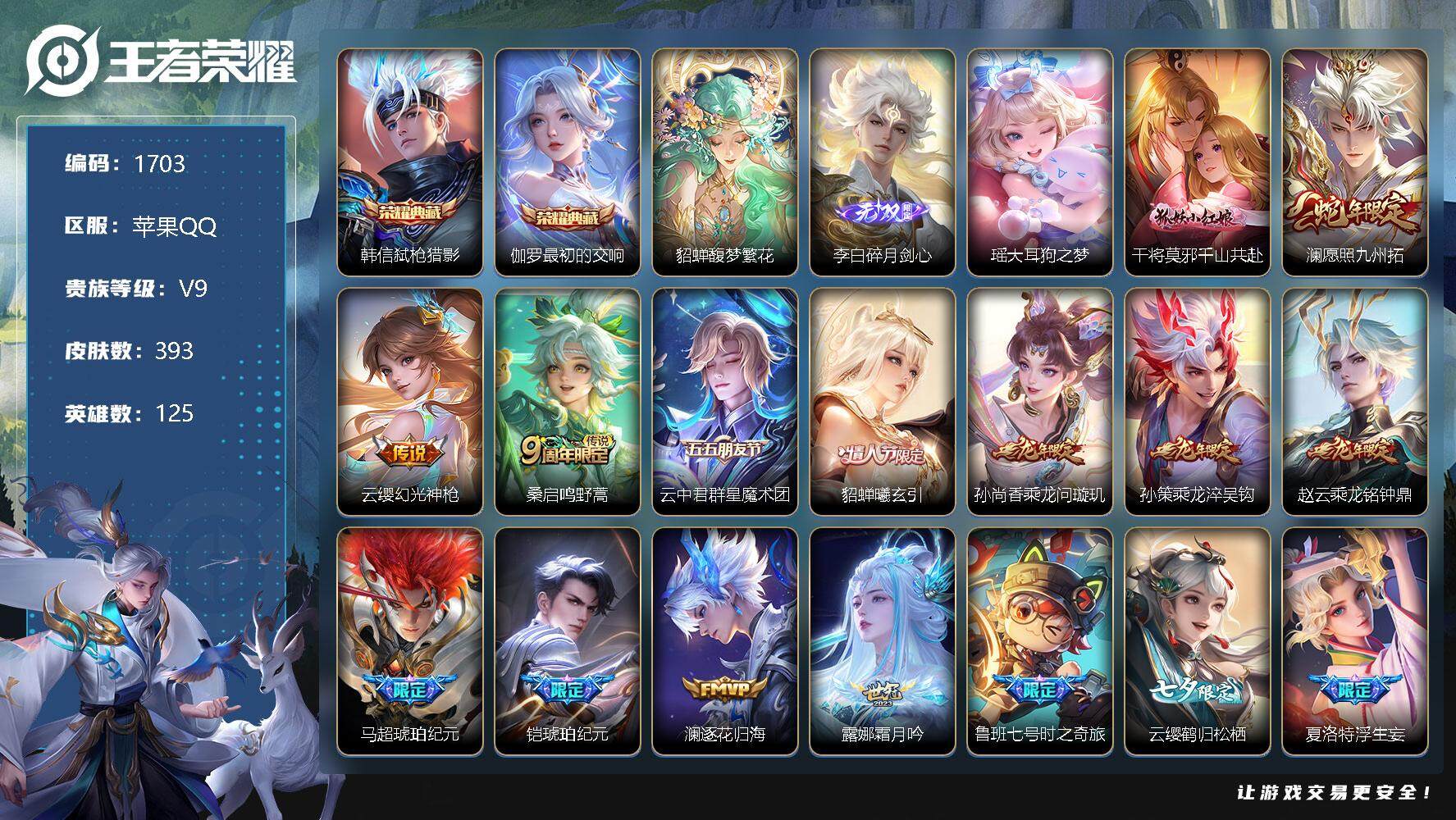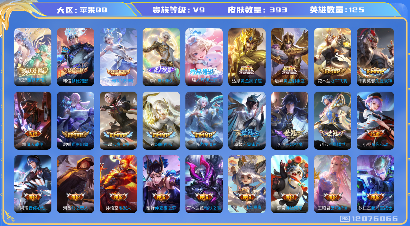 [12076066]【商品标题】:苹果Q-V9-至尊星耀III段位-125英雄-393皮肤-2典藏-1珍品无双-1无双-1珍品传说-52传说-105史诗