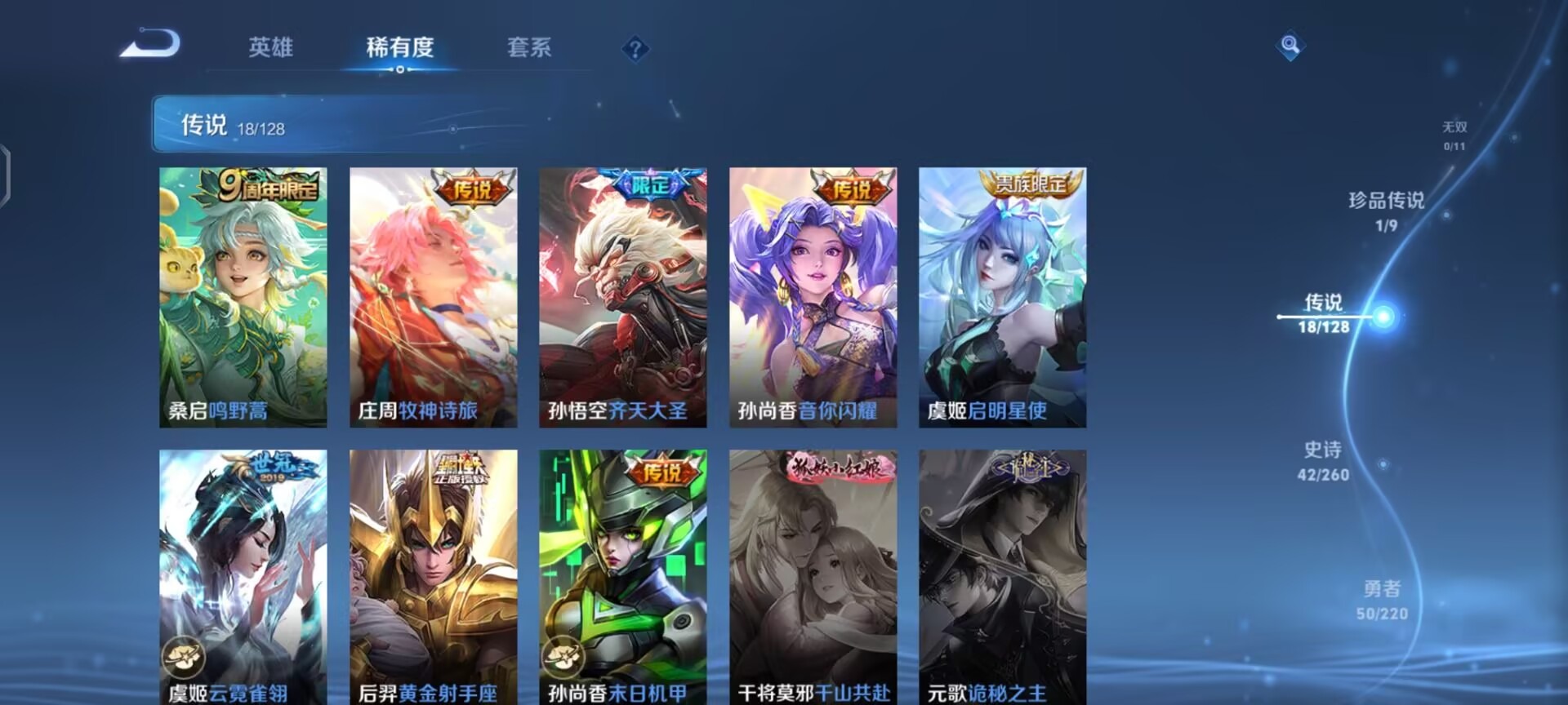 - [12076260]V7 5传说 120英雄 157皮肤 可修改实名 优质装备:久胜战神 珍宝阁皮:妄想食味 限定皮:愿照·千秋盛(女娲年限),鸣野蒿,至尊宝,白虎志(电光耗子),凤求凰(白切鸡),神威(电光马子),五谷丰年,梁祝,李小龙,如梦令-后羿 史诗皮:化蝶舞,星界战将,百相守梦-黄忠,紫霞仙子,电玩小子(小书包),白龙吟,黄金分割率,特工魅影,魅语,冰冠公主,猫狗日记-孙策,时之恋人-孙尚香,节奏热浪,水果甜心,星夜王子,德古拉伯爵,幽灵船长,鬼剑武藏,纤云弄巧,繁星吟游(呼啦呼啦),缤纷独角兽,乘风破浪,逐浪之夏,水晶猎龙者,曙光守护者,箭羽风息,金属风暴,原初追逐者,圣诞狂欢,圣诞恋歌,鹰眼统帅,暗夜贵公子,魅力维加斯,黎明之约