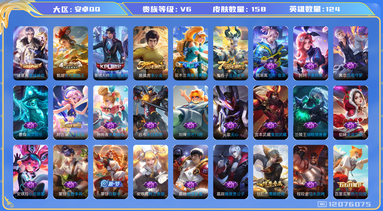 [12076075]V6 1典藏 124英雄 158皮肤 可修改实名 优质装备:星域神启(倪克斯贼亮) 珍宝阁皮:万物之道,女武神 限定皮:五谷丰年,李小龙,青春决赛季,女儿国国王,匿光启智者 史诗皮:百相守梦-黄忠,江河有灵,百解令(蒙犽),末日机甲-吕布,节奏热浪,摇滚巨星,水果甜心,天才门将,心灵骇客,时之奇旅-安琪拉,功夫厨神,暗隐猎兽者,幽灵船长,鬼剑武藏,拒霜思,逐浪之夏,龙鼓争鸣,热力回旋,金属风暴,圣诞恋歌,鹰眼统帅,暗夜贵公子,魅力维加斯,天秀·音浪,无心