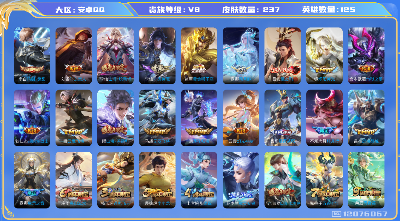 [12076067]V6 1典藏 23传说 125英雄 237皮肤 可修改实名 优质装备:鸣剑·曳影,黄金狮子座,云鹰飞将(小将军),炽阳神光,一念神魔,地狱之眼,时之恋人-刘备(电焊工),超时空战士-狄仁杰,无双飞将,山海·炽霜斩(李信年限),山海·苍雷引(电光曜子),霜月吟,澜逐花归海,涂山容容 传说皮:吕布曦玄引,幻光神枪 珍宝阁皮:胡桃夹子,女武神 限定皮:愿照·九州拓(澜年限),逐霄战戟,鸣野蒿,至尊宝,补天,绯月行,飞衡(韩信年限),遇见飞天,高山流水,齐天大圣,怒海麟威,五谷丰年,武圣,梁祝,李小龙,默契交锋-花木兰,启示之音,山海·玄木吟(马可年限) 史诗皮:星界战将,东方月初,蒙犽顽岩魄,埋骨钱,决胜骁骑,百相守梦-黄忠,紫霞仙子,永昼,魅语,百解令(蒙犽),高渐离燃音魔法,蒙恬荣光圣徽,无限星赏官,晚萤,电玩·爆裂旋风,暗夜猫娘,末日机甲-吕布,猫狗日记-孙策,时之恋人-孙尚香,节奏热浪,修罗,摇滚巨星,水果甜心,心灵骇客,德古拉伯爵,暗隐猎兽者,鬼剑武藏,心灵战警,舞动绿茵,纤云弄巧,繁星吟游(呼啦呼啦),拒霜思,乘风破浪,逐浪之夏,水晶猎龙者,金属风暴,圣诞狂欢,圣诞恋歌,鹰眼统帅,魅力维加斯,黎明之约,无心,玫瑰异探