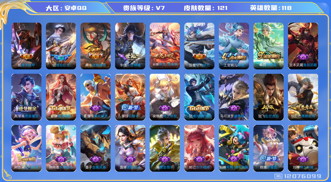 [12076099]V7 7传说 118英雄 121皮肤 可修改实名 优质装备:绛天战甲(鸡嘴战神),一念神魔,碎云,琥珀纪元铠 传说皮:乘龙·淬吴钩(孙策年限),典韦战鼓燎原 珍宝阁皮:万物之道 限定皮:鸣野蒿,梁祝 史诗皮:星界特工,紫霞仙子,江河有灵,百解令(蒙犽),高渐离燃音魔法,电玩·爆裂旋风,乱世虎臣,女仆咖啡,水果甜心,绅士熊喵,时之奇旅-安琪拉,鬼剑武藏,拒霜思,乘风破浪,曙光守护者,唤灵魅影,金属风暴,鹰眼统帅,赏金猎手