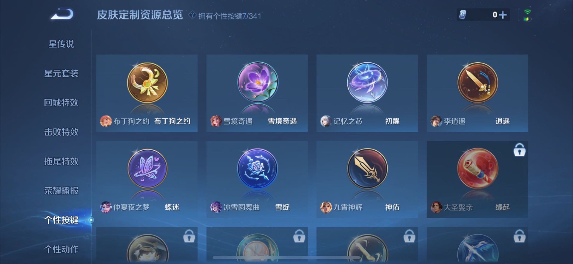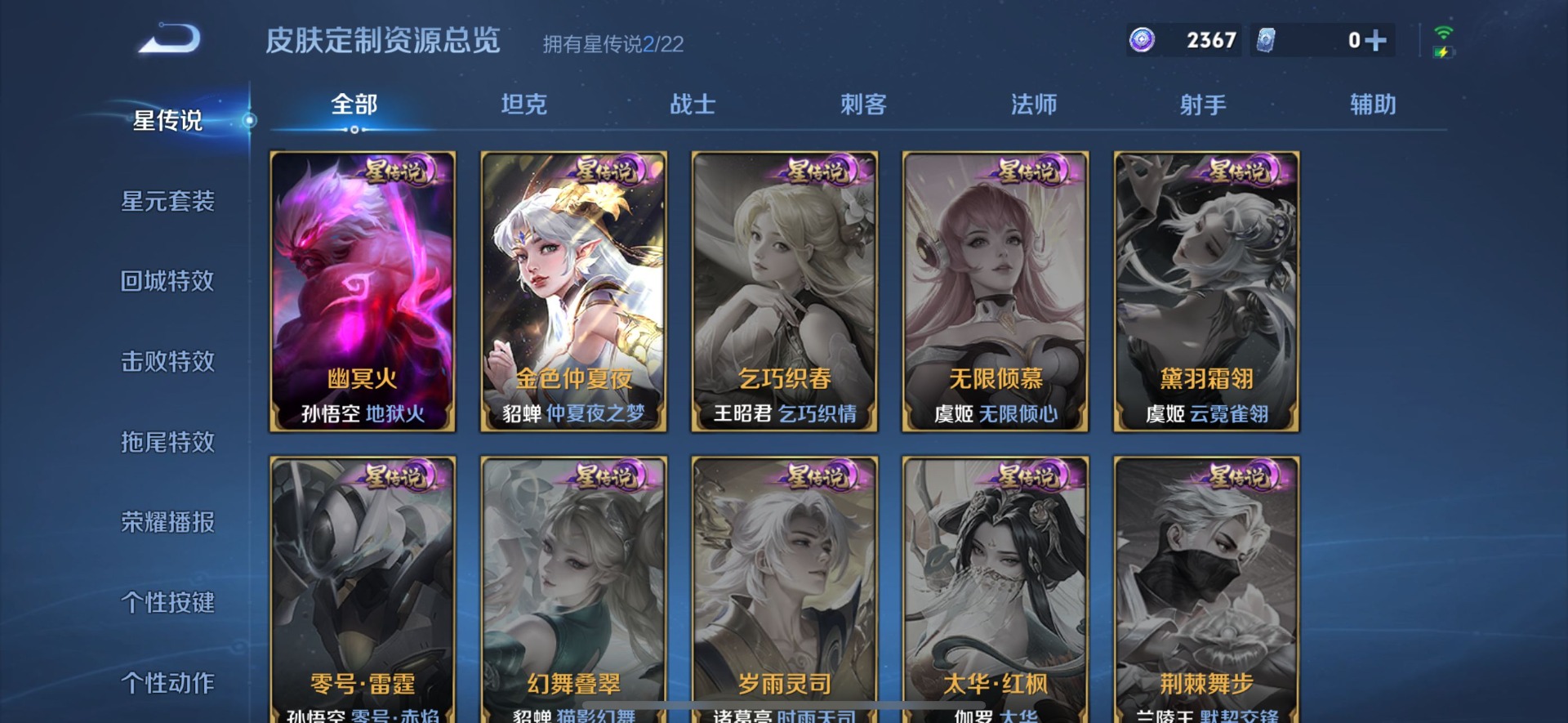 甄姬女儿国国王,铠青龙志,曹操天狼征服者,伽罗太华,赵云龙胆,孙膑天狼运算者,孙尚香异界灵契,项羽霸王别姬,后羿如梦令,庄周云端筑梦师,裴擒虎李小龙,上官婉儿梁祝,花木兰默契交锋,花木兰青春决赛季,马可波罗逐梦之星,桑启鸣野蒿,猪八戒猪悟能,孙悟空孙行者,孙悟空大圣娶亲,孙悟空至尊宝,芈月白晶晶,马超神威,韩信飞衡,虞姬霸王别姬,嫦娥如梦令
