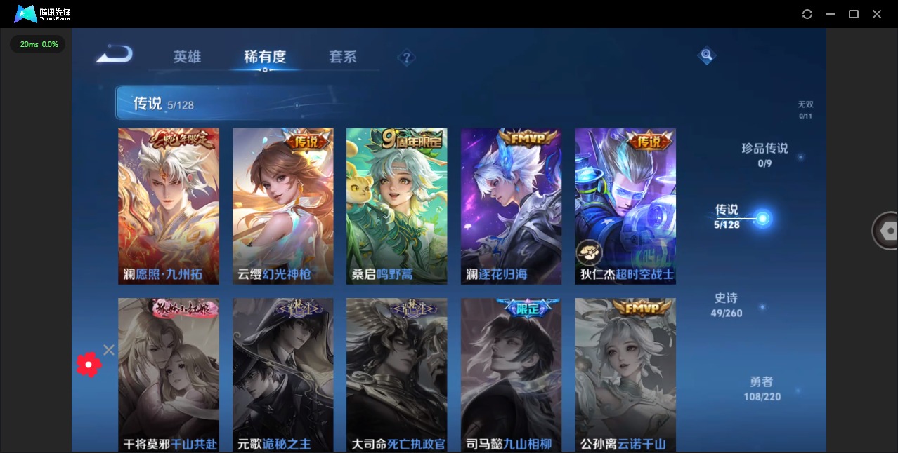 - [12297637]V8 2典藏 22传说 124英雄 321皮肤 可修改实名 优质装备:鸣剑·曳影,银白咏叹调(倪克斯侍卫),云鹰飞将(小将军),炽阳神光,一念神魔,地狱之眼,音你心动-周瑜,李逍遥,超时空战士-狄仁杰,遇见胡旋,无双飞将,山海·炽霜斩(李信年限),画中仙,澜逐花归海 传说皮:幻光神枪 珍宝阁皮:妄想食味,优雅恋人,女武神 限定皮:愿照·九州拓(澜年限),鸣野蒿,凤求凰(白切鸡),武陵仙君(小桃花),寅虎·展翼(孙膑年限),绯月行,神威(电光马子),高山流水,诗剑行,匿光决锋者,降魔,五谷丰年,青龙志(铠年限),武圣,梁祝,御风骁将(吕布年限),岱宗(典韦年限),天狼溯光者,李小龙,如梦令-后羿,孙行者,一生所爱,匿光追影者,女儿国国王,寅虎·御盾(廉颇年限),寅虎·心曲(虎婆),寅虎·赤拳(老虎年限),时之祈愿-云中君,百木心枪,玉兔公主,山海·玄木吟(马可年限) 史诗皮:器灵·浮梦炉,灵蛊蚀心,星界战将,龙之律动,茶境仙,战舞者,东方月初,蒙犽顽岩魄,埋骨钱,百相守梦-黄忠,紫霞仙子,电玩小子(小书包),白龙吟,黄金分割率,特工魅影,千年之狐,永昼,魅语,高渐离燃音魔法,蒙恬荣光圣徽,无限星赏官,冰冠公主,百相守梦(刘备),末日机甲-吕布,猫狗日记-孙策,时之恋人-孙尚香,乱世虎臣,节奏热浪,修罗,女仆咖啡,摇滚巨星,水果甜心,绅士熊喵,天才门将,星夜王子,心灵骇客,时之奇旅-安琪拉,功夫厨神,德古拉伯爵,暗隐猎兽者,幽灵船长,鬼剑武藏,暗渊魔法,心灵战警,乐园奇幻夜,舞动绿茵,地狱岩魂,纤云弄巧,拒霜思,缤纷独角兽,乘风破浪,逐浪之夏,水晶猎龙者,曙光守护者,热力回旋,金属风暴,圣诞狂欢,圣诞恋歌,鹰眼统帅,魅力维加斯,黎明之约,赏金猎手,寅虎·御盾,无心,未来纪元-赵云
