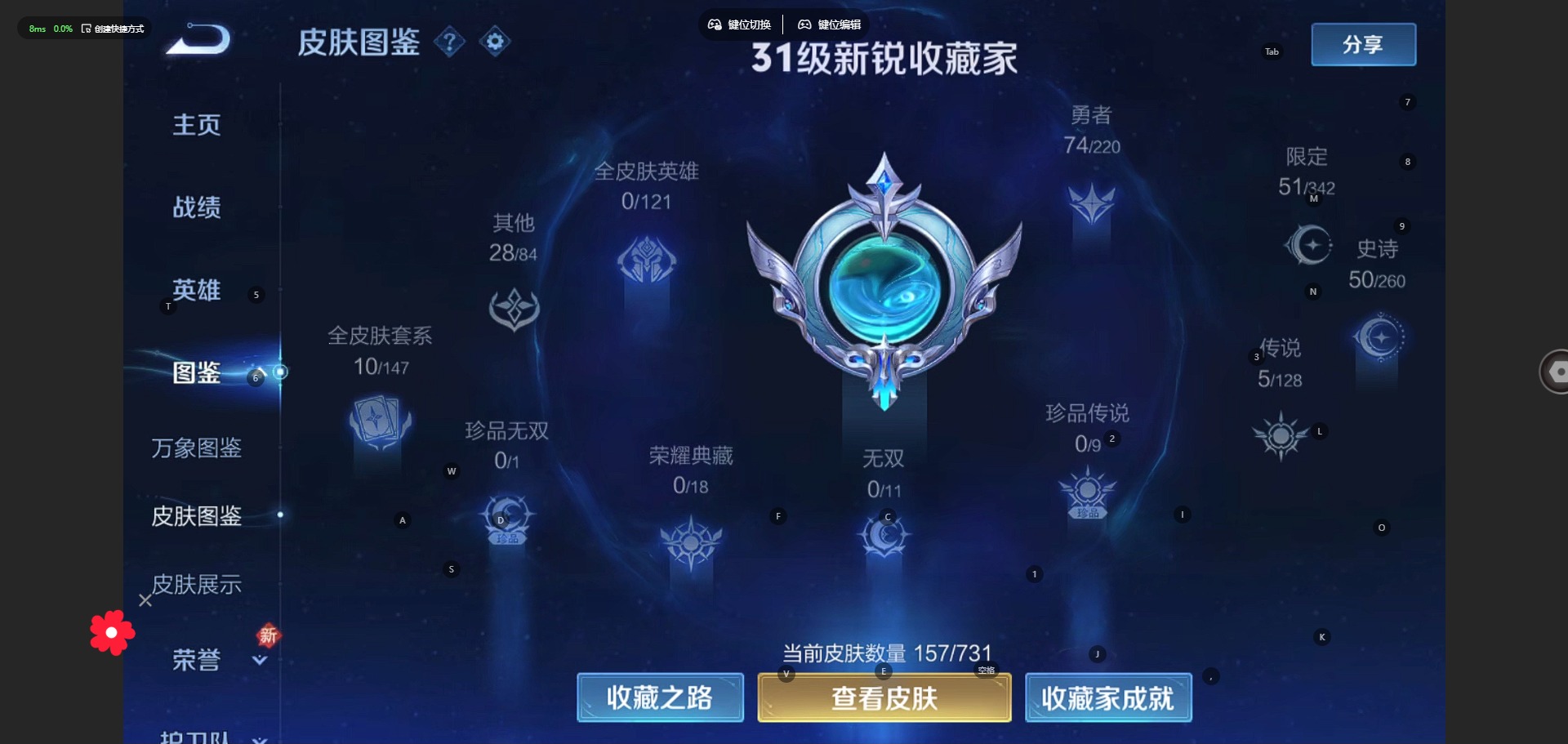 - PX_2109994-Q/非凡王者/204皮肤/124英雄/1典藏/0珍品无双/1无双/3珍品传说/18传说/63史诗/8稀有英雄 【3 珍品传说】怪盗基德 马可波罗,时之奇旅 孙策,兔狲·蓬尾 张飞, 【1 典藏皮肤】九霄神辉 花木兰, 【1 无双皮肤】离恨烟 公孙离, 【18 传说皮肤】启明星使 虞姬,逐花归海 澜,深海之息 马可波罗,游龙清影 西施,诗剑行 李白,浮生妄 夏洛特,仲夏夜之梦