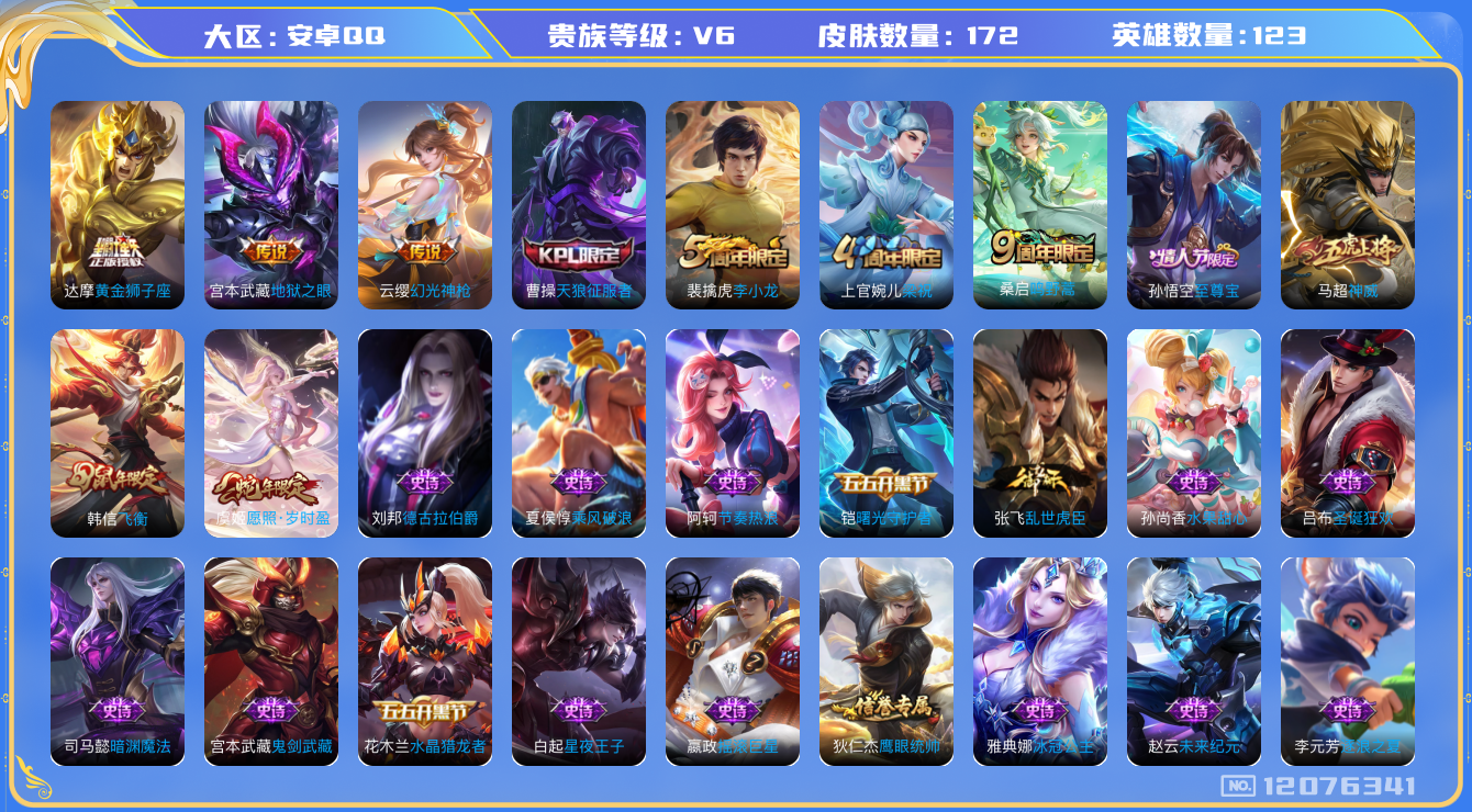 - PX_2068324-贵族8/皮肤247/典藏2/传说16/史诗81/英雄123/弑枪猎影/瑶拾光映像/张飞兔狲蓬尾/宫本武藏黑崎一护/蔷薇恋人/特工战影/仲夏夜之梦/一念神魔/云鹰飞将/零号赤焰/启明星使/炽阳神光/无双飞将/碎云/怒海麟威/鹤羽星尊/遇见神鼓/桑启鸣野蒿/云缨幻光神枪/澜愿照九州拓/女娲愿照千秋盛/司空震愿照山河定/蔡文姬夏日便利店/虞姬夏日便利店/姜子牙天穹之誓/杨戬破阵退雄