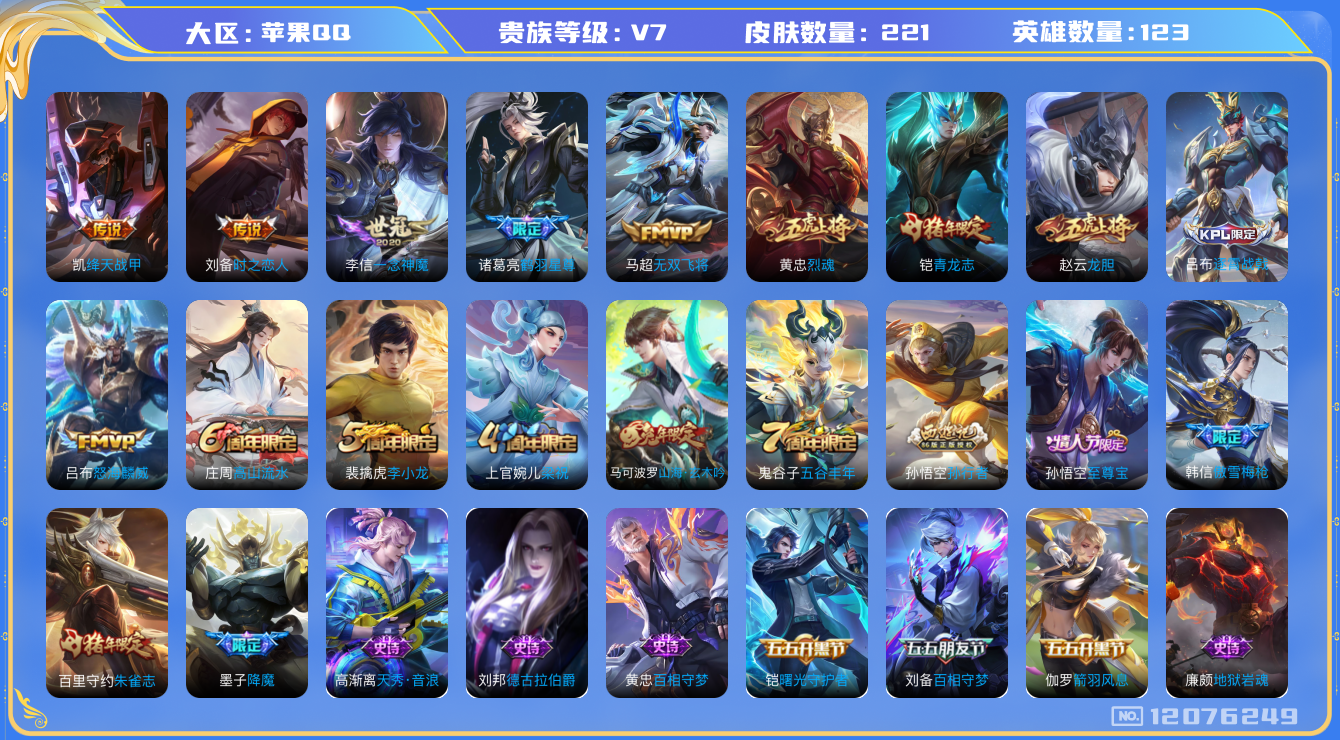 [12076249]V7 6传说 123英雄 221皮肤 可修改实名 优质装备:绛天战甲(鸡嘴战神),一念神魔,时之恋人-刘备(电焊工),无双飞将,鹤羽星尊,涂山容容 珍宝阁皮:蔷薇恋人,玩趣恶龙 限定皮:逐霄战戟,至尊宝,傲雪梅枪,高山流水,怒海麟威,降魔,五谷丰年,青龙志(铠年限),梁祝,龙胆,烈魂,李小龙,朱雀志(守约年限),孙行者,山海·玄木吟(马可年限) 史诗皮:百相守梦-周瑜,百相守梦-黄忠,江河有灵,蒙恬荣光圣徽,偶像歌手,电玩·爆裂旋风,百相守梦(刘备),末日机甲-吕布,猫狗日记-孙策,修罗,女仆咖啡,摇滚巨星,水果甜心,天才门将,星夜王子,功夫厨神,德古拉伯爵,暗隐猎兽者,鬼剑武藏,心灵战警,地狱岩魂,纤云弄巧,逐浪之夏,水晶猎龙者,曙光守护者,箭羽风息,金属风暴,鹰眼统帅,魅力维加斯,赏金猎手,天秀·音浪,千筹问战,无心,未来纪元-赵云