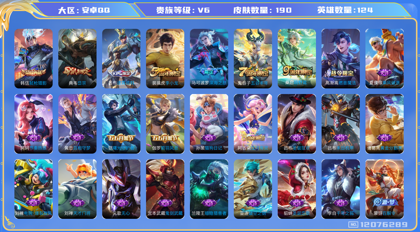[12076289]V6 1典藏 2传说 124英雄 190皮肤 可修改实名 优质装备:弑枪猎影(韩信典藏) 珍宝阁皮:蔷薇恋人 限定皮:逐霄战戟,鸣野蒿,五谷丰年,岱宗(典韦年限),李小龙,深海之息(深海大菠萝) 史诗皮:破空之剑,百相守梦-百里守约,百相守梦-黄忠,织梦人,黄金分割率,特工魅影,千年之狐,江河有灵,百解令(蒙犽),高渐离燃音魔法,蒙恬荣光圣徽,冰冠公主,电玩·爆裂旋风,末日机甲-吕布,猫狗日记-孙策,节奏热浪,女仆咖啡,摇滚巨星,天才门将,星夜王子,功夫厨神,暗隐猎兽者,鬼剑武藏,心灵战警,舞动绿茵,纤云弄巧,拒霜思,乘风破浪,曙光守护者,箭羽风息,金属风暴,圣诞狂欢,圣诞恋歌,鹰眼统帅,魅力维加斯,无心,未来纪元-赵云