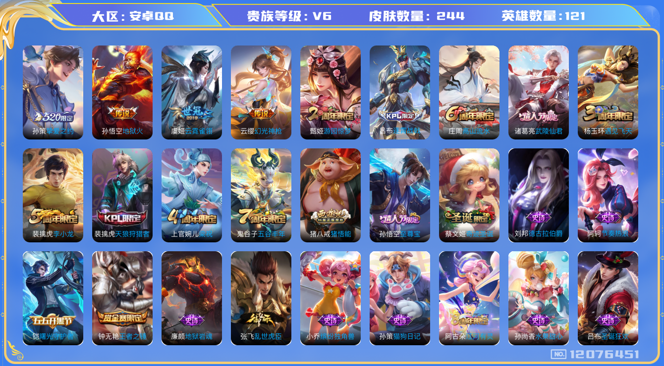 [12076451]V6 5传说 121英雄 244皮肤 可修改实名 优质装备:云霓雀翎,地狱火,挚爱之约 传说皮:幻光神枪 珍宝阁皮:女武神,玩趣恶龙 限定皮:逐霄战戟,至尊宝,武陵仙君(小桃花),遇见飞天,高山流水,五谷丰年,游园惊梦,梁祝,天狼狩猎者,李小龙,奇迹圣诞,猪悟能 史诗皮:芈月浮光幕影,千年之狐,江河有灵,蒙恬荣光圣徽,无限星赏官,猫狗日记-孙策,乱世虎臣,节奏热浪,水果甜心,功夫厨神,德古拉伯爵,鬼剑武藏,地狱岩魂,纤云弄巧,繁星吟游(呼啦呼啦),拒霜思,缤纷独角兽,水晶猎龙者,曙光守护者,金属风暴,原初追逐者,圣诞狂欢,鹰眼统帅,王者之锤,魅力维加斯,黎明之约,无心,未来纪元-赵云
