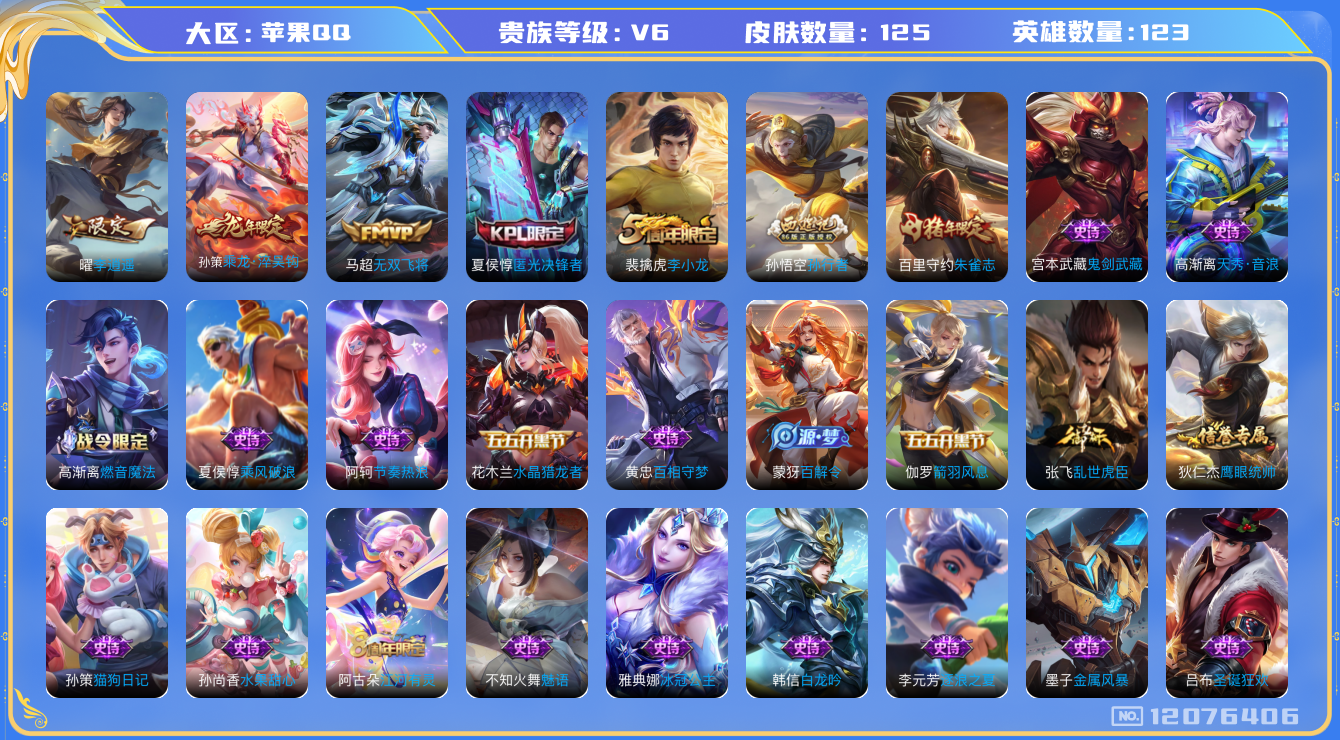 [12076406]V6 3传说 123英雄 125皮肤 可修改实名 优质装备:李逍遥,无双飞将 传说皮:乘龙·淬吴钩(孙策年限) 珍宝阁皮:妄想食味 限定皮:匿光决锋者,李小龙,朱雀志(守约年限),孙行者 史诗皮:龙之律动,百相守梦-黄忠,白龙吟,黄金分割率,江河有灵,魅语,百解令(蒙犽),高渐离燃音魔法,冰冠公主,晚萤,猫狗日记-孙策,乱世虎臣,节奏热浪,修罗,女仆咖啡,水果甜心,鬼剑武藏,乘风破浪,逐浪之夏,水晶猎龙者,箭羽风息,金属风暴,圣诞狂欢,鹰眼统帅,魅力维加斯,赏金猎手,天秀·音浪