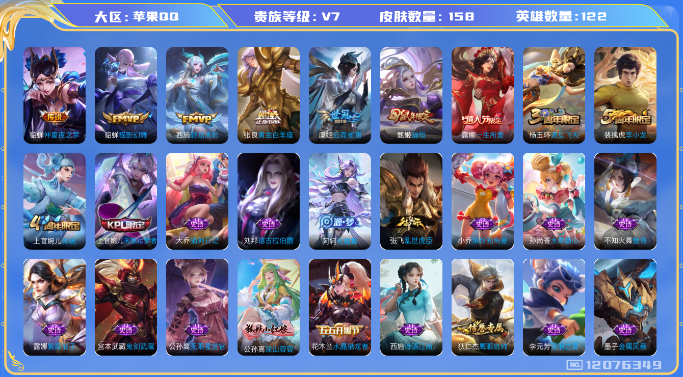 - [11651195]V8 1典藏 1珍品传说 13传说 125英雄 283皮肤 可修改实名 优质装备:星域神启(倪克斯贼亮),江户川柯南,冠军飞将,云霓雀翎,末日机甲-孙尚香(绿蚂蚱),地狱之眼,胖达荣荣,超时空战士-狄仁杰,无双飞将 珍宝阁皮:蔷薇恋人 限定皮:愿照·九州拓(澜年限),鸣野蒿,至尊宝,白虎志(电光耗子),凤求凰(白切鸡),神威(电光马子),飞衡(韩信年限),青龙志(铠年限),梁祝,御风骁将(吕布年限),天狼狩猎者,逐梦之星,岱宗(典韦年限),天狼征服者,逐梦之光,玄武志(苏烈年限),朱雀志(守约年限),永曜之星,辉光之辰,奇迹圣诞,大圣娶亲,引擎之心,青春决赛季,冰霜恋舞曲,云端筑梦师,神奇女侠 史诗皮:鸭鸭历险记-刘禅,化蝶舞,龙之律动,百相守梦-周瑜,茶境仙,百相守梦-百里守约,百相守梦-黄忠,紫霞仙子,白龙吟,黄金分割率,特工魅影,千年之狐,江河有灵,蒙恬荣光圣徽,无限星赏官,冰冠公主,偶像歌手,暗夜猫娘,猫狗日记-孙策,猫狗日记-大乔,乱世虎臣,节奏热浪,修罗,水果甜心,绅士熊喵,星夜王子,心灵骇客,暗隐猎兽者,幽灵船长,鬼剑武藏,心灵战警,乐园奇幻夜,舞动绿茵,地狱岩魂,纤云弄巧,繁星吟游(呼啦呼啦),缤纷独角兽,乘风破浪,逐浪之夏,水晶猎龙者,曙光守护者,金属风暴,鹰眼统帅,暗夜贵公子,魅力维加斯,未来纪元-赵云