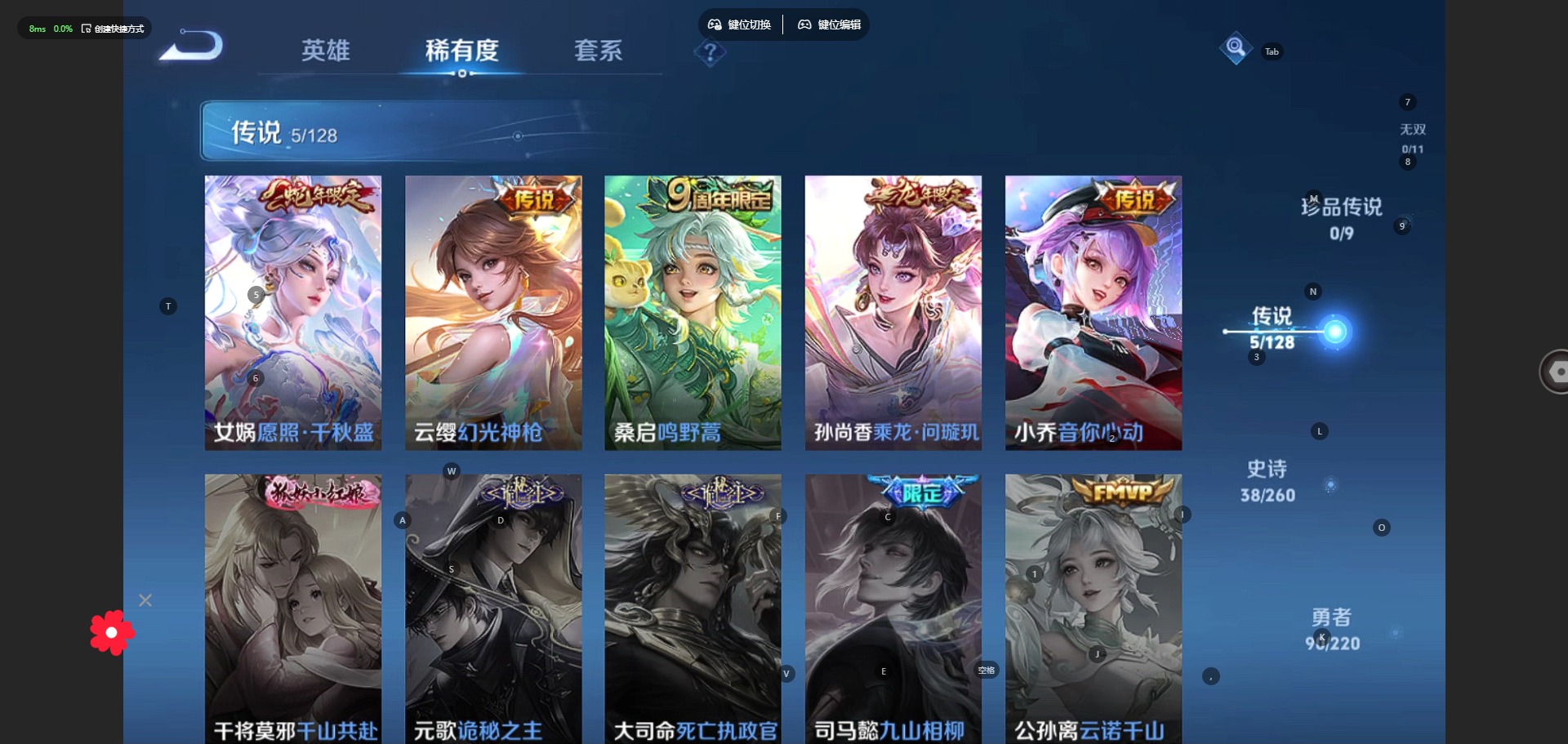 - [12073466]V7 1典藏 9传说 125英雄 216皮肤 可修改实名 优质装备:最初的交响(伽罗典藏),一念神魔,云霓雀翎,仲夏夜之梦(大飞蛾),飞鸢探春,云中君群星魔术团,涂山容容 传说皮:乘龙·问璇玑(孙尚香年限),乘龙·铭钟鼎(赵云年限),乘龙·淬吴钩(孙策年限) 珍宝阁皮:蔷薇恋人 限定皮:愿照·岁时盈(虞姬年限),逐霄战戟,高山流水,游园惊梦 史诗皮:赞萌露比,鸭鸭历险记-刘禅,器灵·浮梦炉,化蝶舞,星界战将,龙之律动,雪豹·霜爪,石田雨龙,百相守梦-周瑜,茶境仙,上官婉儿群星魔术团,乘龙·聚宝船(安琪拉年限),乘龙·忆丹青(大乔年限),百相守梦-百里守约,百相守梦-黄忠,织梦人,紫霞仙子,电玩小子(小书包),黄金分割率,特工魅影,江河有灵,匿光侦查者,真我赫兹(百里守约),完美假期,魅语,百解令(蒙犽),高渐离燃音魔法,青蛇,偶像歌手,晚萤,暗夜猫娘,末日机甲-吕布,猫狗日记-孙策,猫狗日记-大乔,时之恋人-孙尚香,节奏热浪,修罗,女仆咖啡,摇滚巨星,水果甜心,天才门将,星夜王子,功夫厨神,德古拉伯爵,暗隐猎兽者,鬼剑武藏,心灵战警,乐园奇幻夜,天秀·启明,纤云弄巧,拒霜思,缤纷独角兽,乘风破浪,逐浪之夏,曙光守护者,箭羽风息,圣诞狂欢,圣诞恋歌,鹰眼统帅,魅力维加斯,黎明之约