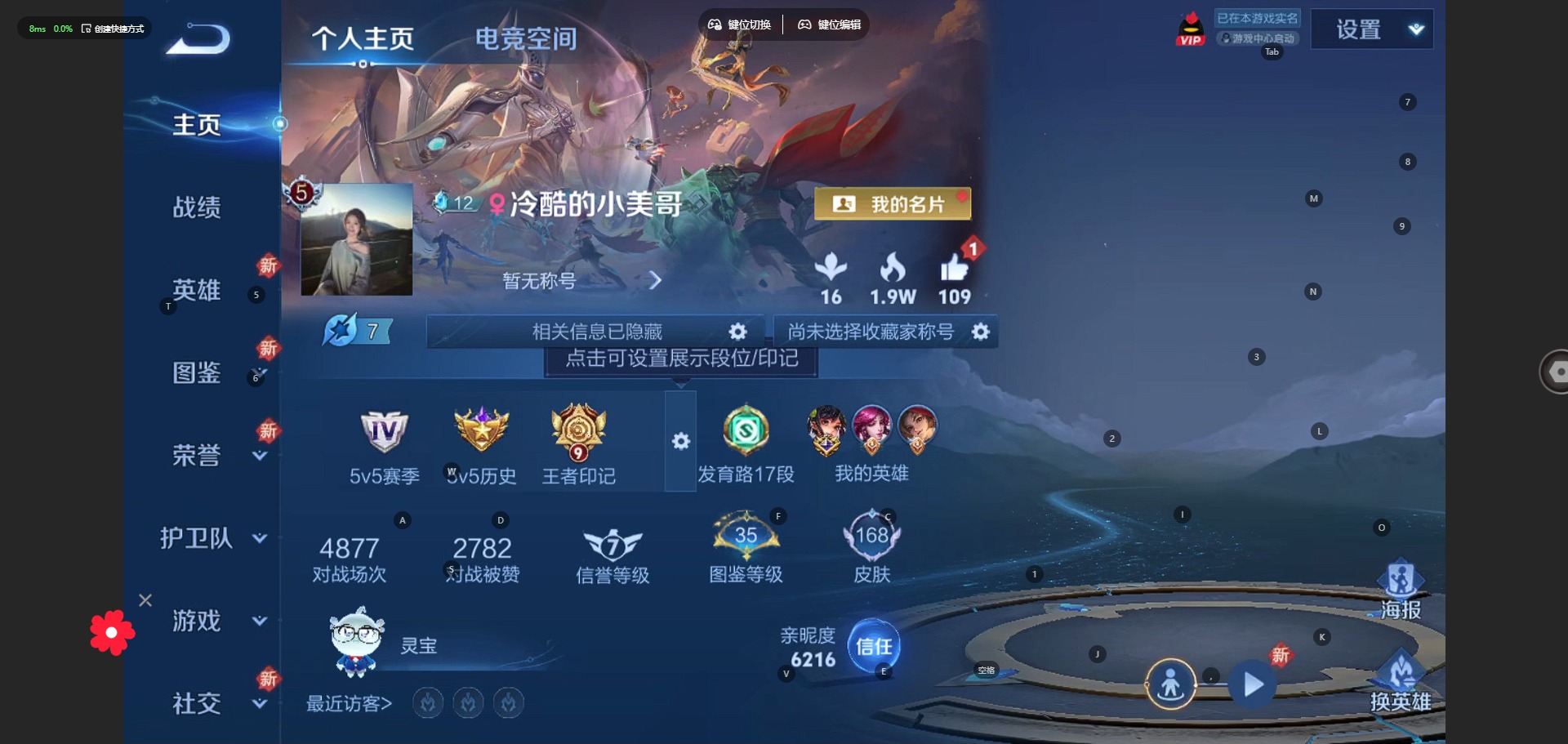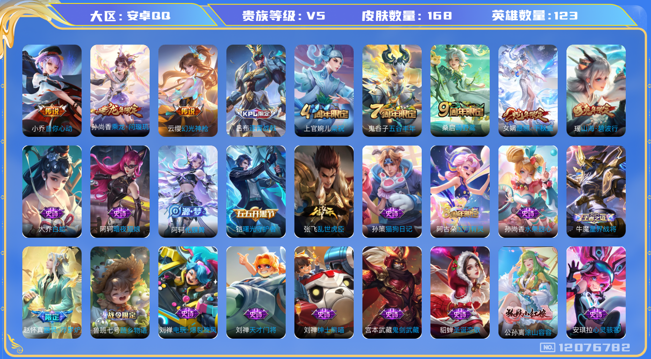 [12076782]V5 5传说 123英雄 168皮肤 可修改实名 优质装备:音你心动-小乔,涂山容容 传说皮:乘龙·问璇玑(孙尚香年限),幻光神枪 珍宝阁皮:蔷薇恋人,女武神 限定皮:愿照·千秋盛(女娲年限),逐霄战戟,鸣野蒿,山海·碧波行(瑶年限),五谷丰年,梁祝 史诗皮:器灵·浮梦炉,化蝶舞,星界战将,龙之律动,蒙犽顽岩魄,蔬乡物语(鲁班七号),江河有灵,蒙恬荣光圣徽,偶像歌手,白蛇,电玩·爆裂旋风,暗夜猫娘,猫狗日记-孙策,乱世虎臣,女仆咖啡,摇滚巨星,水果甜心,绅士熊喵,天才门将,心灵骇客,功夫厨神,鬼剑武藏,舞动绿茵,纤云弄巧,拒霜思,逐浪之夏,曙光守护者,金属风暴,圣诞恋歌,鹰眼统帅