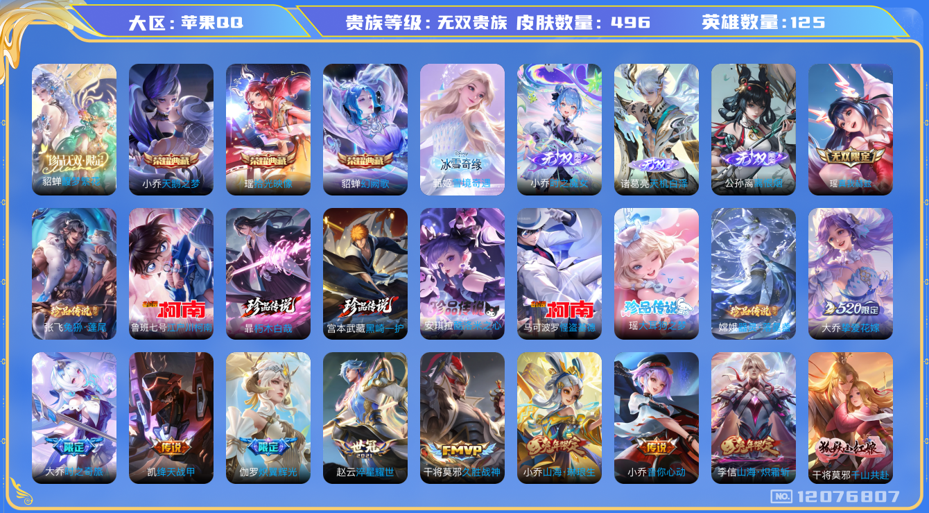 [12076807]无双贵族 3典藏 1珍品无双 5无双 8珍品传说 50传说 125英雄 496皮肤 可修改实名 优质装备:馥梦繁花,天鹅之梦(小乔典藏),幻阙歌(貂蝉典藏),真我赫兹(瑶)(瑶无双),小乔时之魔女(小乔无双),离恨烟(公孙离无双),拾光映像(瑶典藏),雪境奇遇-甄姬,天机白泽,江户川柯南,怪盗基德,器灵·落星盏,酷洛米之心,大耳狗之梦,朽木白哉,黑崎一护,绛天战甲(鸡嘴战神),猫影幻舞,久胜战神,炽阳神光,一念神魔,云霓雀翎,末日机甲-孙尚香(绿蚂蚱),仲夏夜之梦(大飞蛾),音你心动-小乔,地狱之眼,淬星耀世,挚爱花嫁,无双飞将,山海·炽霜斩(李信年限),山海·琳琅生(小乔年限),山海·苍雷引(电光曜子),炽翼辉光(娃娃菜牛角包),燃星之曲,大乔-时之奇旅,永恒水手月亮,夜礼服假面,澜逐花归海,艾琳觅芳踪,朵莉亚心动手记,千劫归真,诡秘之主,千山共赴,涂山容容 珍品传说:兔狲·蓬尾 传说皮:乘龙·问璇玑(孙尚香年限),貂蝉曦玄引,死亡执政官,九山相柳,云诺千山,续相思,幻光神枪 珍宝阁皮:妄想食味,蔷薇恋人,女武神 限定皮:愿照·九州拓(澜年限),愿照·福禄聚(蔡文姬年限),愿照·山河定(司空震年限),愿照·众生和(妲己年限),愿照·千秋盛(女娲年限),逐霄战戟,陌上桑,鸣野蒿,至尊宝,凤凰于飞,寅虎·展翼(孙膑年限),前尘镜,星穹之声,时之彼端,白鹤梁神女,魔法小厨娘,白晶晶,飞衡(韩信年限),山海·碧波行(瑶年限),至美·乘鲤谣,至美·化雀舞,遇见飞天,高山流水,五谷丰年,天狼运算者,游园惊梦,梁祝,御风骁将(吕布年限),天狼溯光者,逐梦之音,祈雪灵祝(雪兔子),李小龙,辉光之辰,如梦令-嫦娥,霸王别姬-虞姬,奇迹圣诞,默契交锋-兰陵王,默契交锋-花木兰,真爱至上,纯白花嫁,孙行者,一生所爱,大圣娶亲,蜜橘之夏,女儿国国王,寅虎·瑞焰(虎皮蛋子),寅虎·心曲(虎婆),寅虎·赤拳(老虎年限),时之祈愿-云中君,时之祈愿-瑶(瑶传限),玉兔公主,启示之音,时之奇旅-妲己,山海·玄木吟(马可年限),冰霜神祇 史诗皮:赞萌露比,鸭鸭历险记-刘禅,器灵·浮梦炉,糖绘人间,狼魂孤将,化蝶舞,灵蛊蚀心,星界战将,谪仙醉月,龙之律动,雪豹·霜爪,藏狐·褐绒,布丁狗之誓,石田雨龙,百相守梦-周瑜,戍鼓铭心,茶境仙,幻珠鲛人,破空之剑,战舞者,涂山红红,东方月初,蒙犽顽岩魄,海
