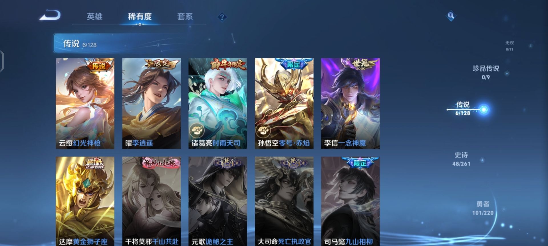 刘邦夺宝奇兵,夏侯惇朔风刀,老夫子醍醐杖,盾山御銮,曹操烛龙,苏烈千军破阵,典韦穷奇,达摩沙漠行僧,牛魔御旌,元歌云间偶戏,兰陵王金庭之子,裴擒虎擒涛扼浪,鲁班大师探海日志,明世隐疑决卦,马可波罗暗影游猎,白起狰,鬼谷子原初探秘者,桑启海盐诗旅,狄仁杰万华元夜,芈月重明,程咬金演武夺筹,扁鹊炼金王,弈星混沌棋,米莱狄御霄,钟馗驱傩正仪,狂铁御狮,太乙真人饕餮