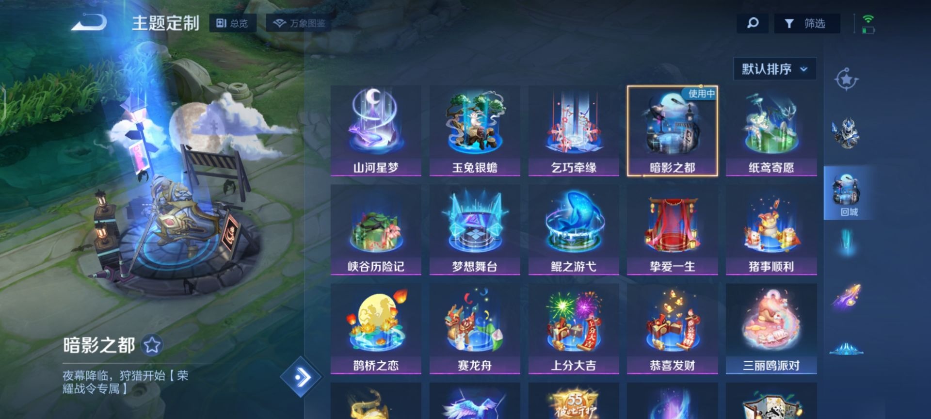 刘邦德古拉伯爵,铠曙光守护者,曹操幽灵船长,吕布圣诞狂欢,露娜紫霞仙子,司马懿暗渊魔法,刘禅天才门将,宫本武藏鬼剑武藏,貂蝉唤灵魅影,李白千年之狐,白起星夜王子,嬴政摇滚巨星,程咬金功夫厨神,百里玄策原初追逐者,雅典娜冰冠公主,雅典娜黎明之约,李元芳逐浪之夏,百里守约特工魅影,墨子龙骑士,墨子金属风暴,王昭君偶像歌手