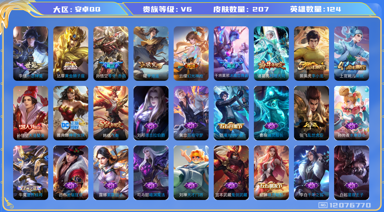 [12076770]V6 6传说 124英雄 207皮肤 可修改实名 优质装备:黄金狮子座,一念神魔,零号·赤焰,李逍遥 传说皮:幻光神枪 珍宝阁皮:优雅恋人,蔷薇恋人 限定皮:时雨天司(水龙头),飞衡(韩信年限),梁祝,李小龙,大圣娶亲,冰霜恋舞曲,神奇女侠 史诗皮:星界战将,龙之律动,百相守梦-黄忠,紫霞仙子,特工魅影,千年之狐,蒙恬荣光圣徽,冰冠公主,偶像歌手,龙骑士(小龙虾),乱世虎臣,摇滚巨星,水果甜心,天才门将,星夜王子,功夫厨神,德古拉伯爵,幽灵船长,鬼剑武藏,暗渊魔法,纤云弄巧,繁星吟游(呼啦呼啦),逐浪之夏,曙光守护者,唤灵魅影,金属风暴,原初追逐者,圣诞狂欢,鹰眼统帅,黎明之约,未来纪元-赵云
