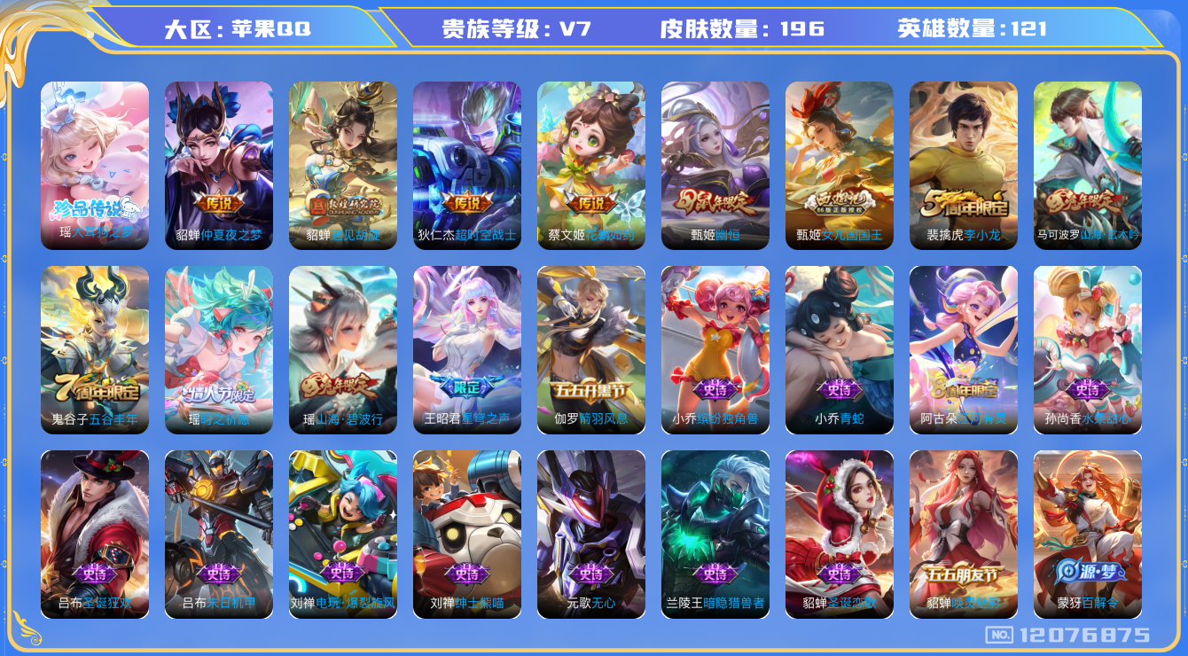 [12076875]V7 1珍品传说 6传说 121英雄 196皮肤 可修改实名 优质装备:大耳狗之梦,仲夏夜之梦(大飞蛾),超时空战士-狄仁杰,遇见胡旋,花朝如约(花篮子) 珍宝阁皮:胡桃夹子,蔷薇恋人 限定皮:星穹之声,山海·碧波行(瑶年限),五谷丰年,幽恒(沐浴露),李小龙,女儿国国王,时之祈愿-瑶(瑶传限),山海·玄木吟(马可年限) 史诗皮:布丁狗之誓,遇见神鹿,白龙吟,特工魅影,江河有灵,百解令(蒙犽),蒙恬荣光圣徽,青蛇,电玩·爆裂旋风,龙骑士(小龙虾),末日机甲-吕布,女仆咖啡,水果甜心,绅士熊喵,功夫厨神,暗隐猎兽者,舞动绿茵,繁星吟游(呼啦呼啦),拒霜思,缤纷独角兽,逐浪之夏,箭羽风息,唤灵魅影,金属风暴,圣诞狂欢,圣诞恋歌,鹰眼统帅,魅力维加斯,无心
