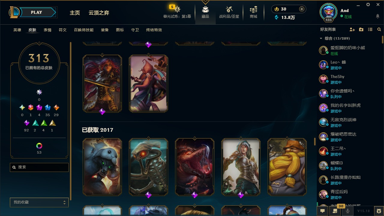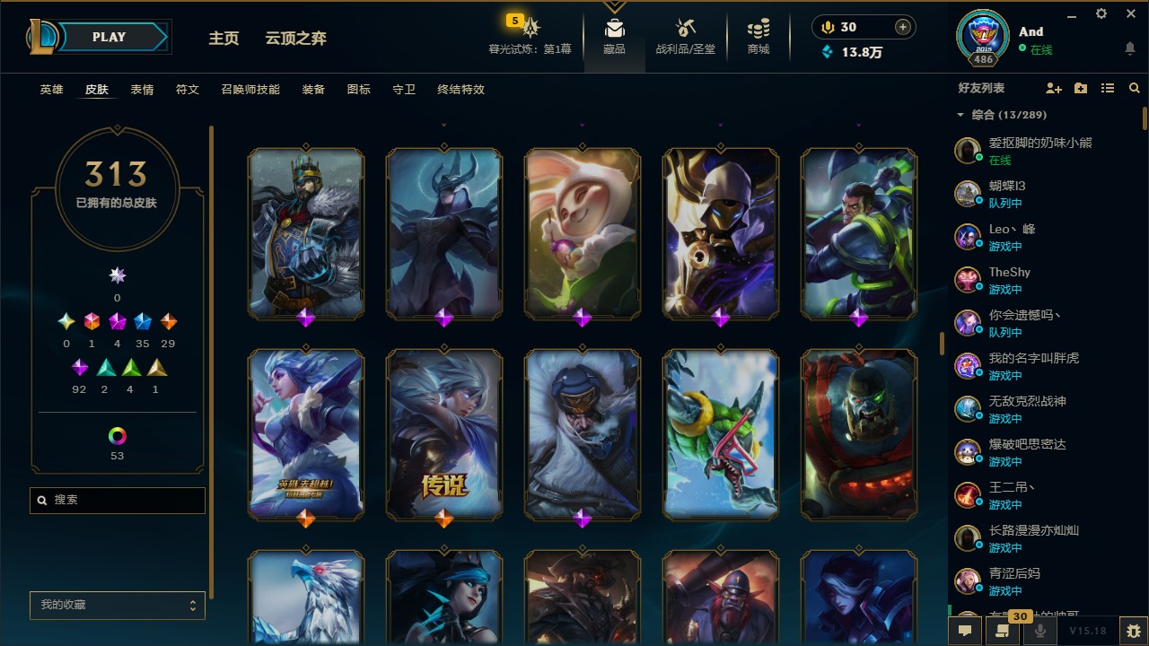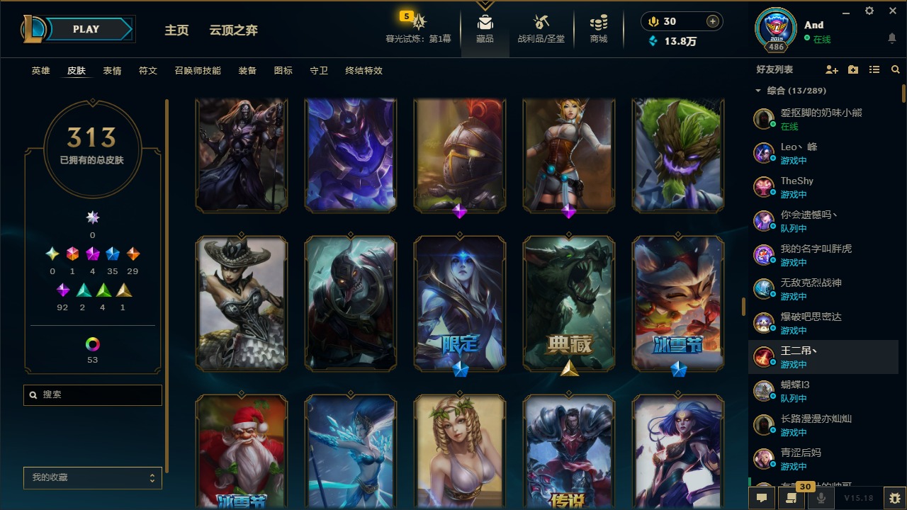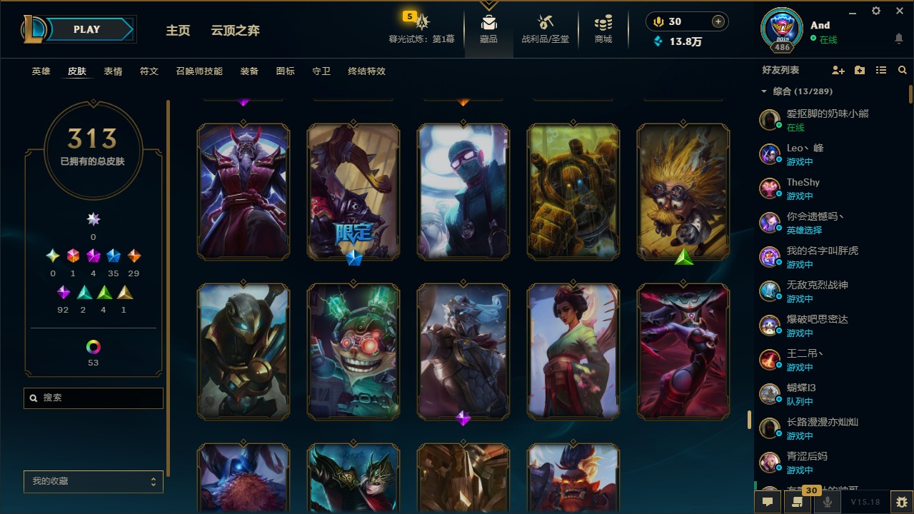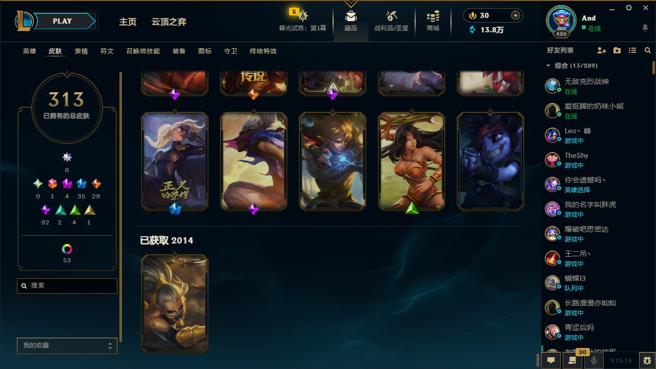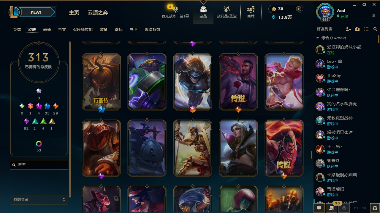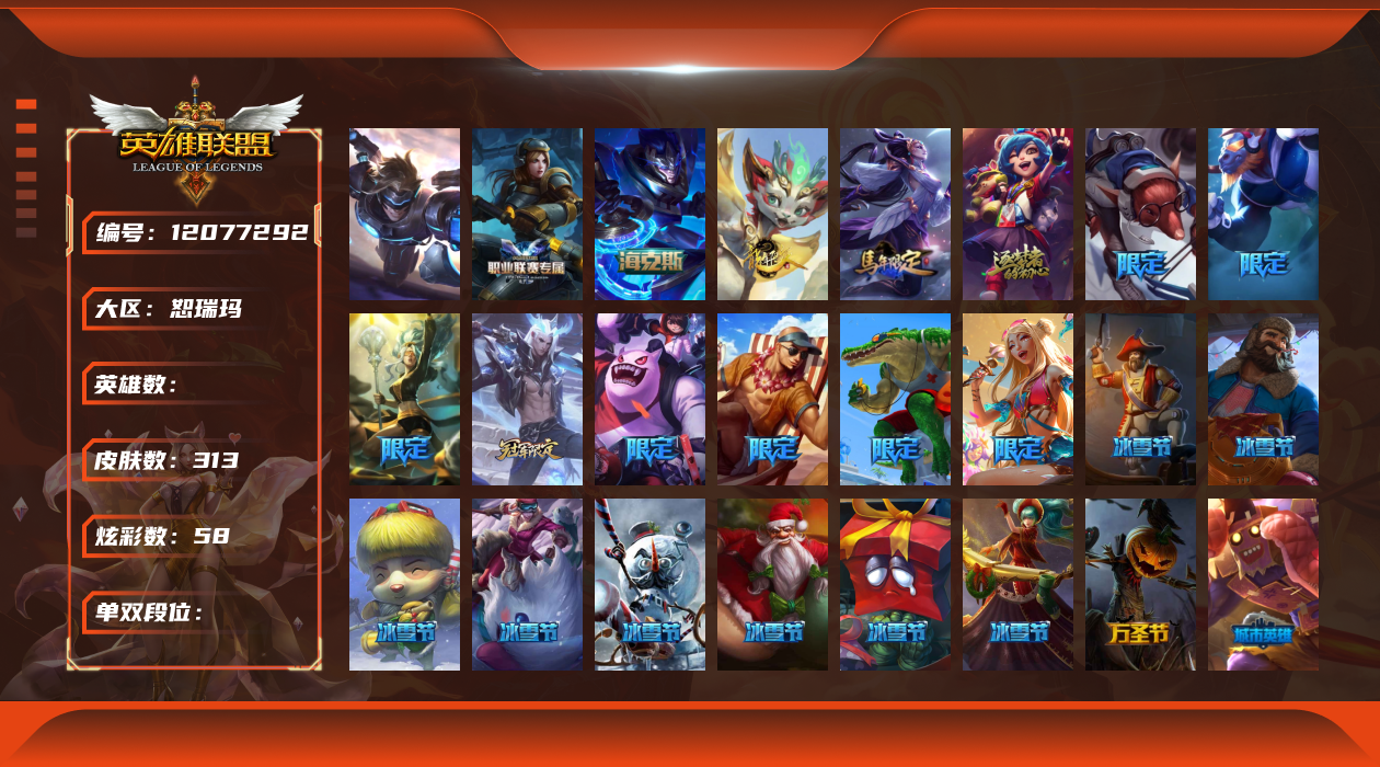 [12077292]1终极 4神话 35限定 29传说 92史诗 313皮肤 58炫彩 可二次 可修改实名 优质装备:源代码 乐芙兰,防爆天使 凯尔,暗影 沃里克,都铎王朝 图奇,红桃杰克 崔斯特,蒙多蒙多,密林猎手 提莫,御魔星矢 寒冰,未来战士,冠军之箭 艾希 凯旋圣装,无畏骑士 瑟庄妮 赤子初心,十五周年纪念 希维尔,暗裔英雄 盖伦 海克斯:海克斯 嘉文四世 限定:钢铁军团 拉克丝 赛季限定皮:胜利凤凰 艾尼维亚,胜利之运 崔斯特,胜利剑圣 易,胜利女神 娑娜,胜利巨口 克格莫,胜利之王 泰达米尔,胜利之剑 剑魔 冠军限定系列:S1FNC 迦娜,S2 暗杀星 努努,S4 SSW 图奇,S5 SKT T1 阿利斯塔,S11 EDG 佛耶戈 冰雪节限定:“主人不要我了” 阿木木,冰雪节 格雷福斯,平安夜女神 娑娜,魄罗骑士 瑟庄妮,圣诞开心鬼 提莫,圣诞老人 酒桶,雪默丁格,英勇玩具兵船长 泳池派对:泳池派对 雷克顿,泳池派对 李青,海之歌 萨勒芬妮 万圣节限定:南瓜头 费德提克 年限:天龙之子 斯莫德,马年 黛安娜 周年:10周年 安妮