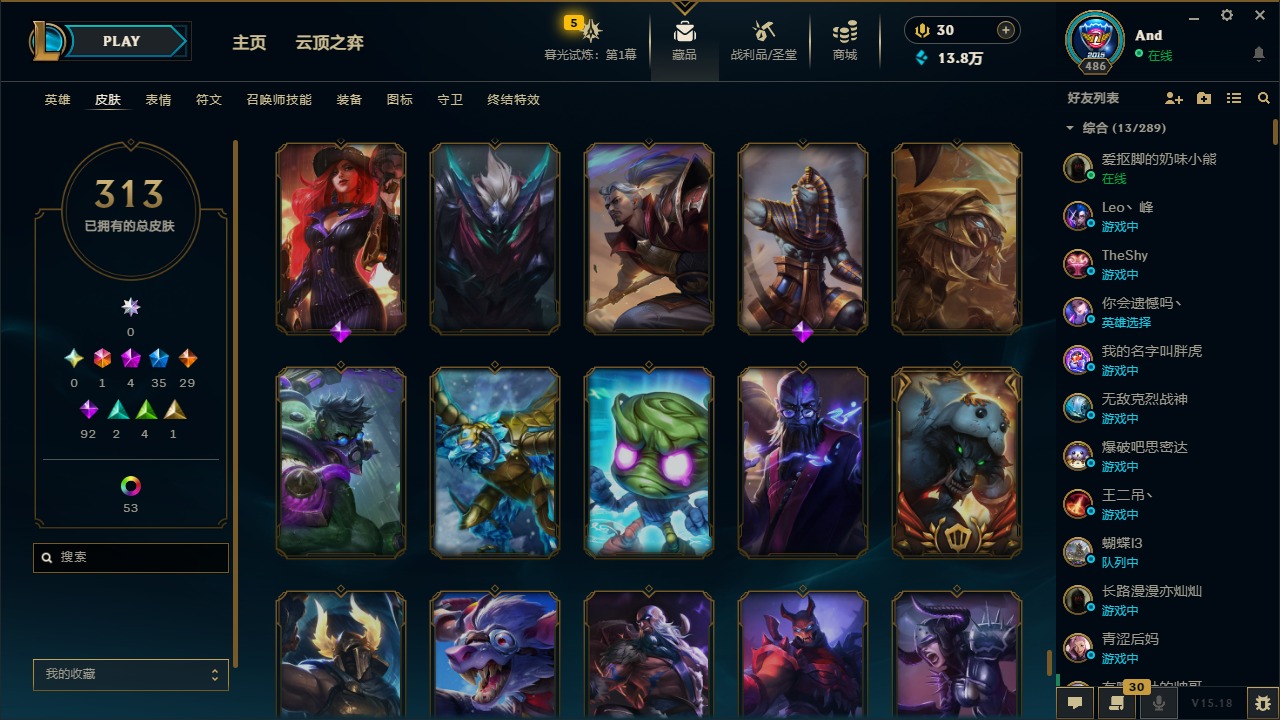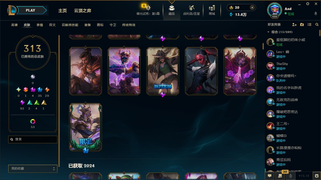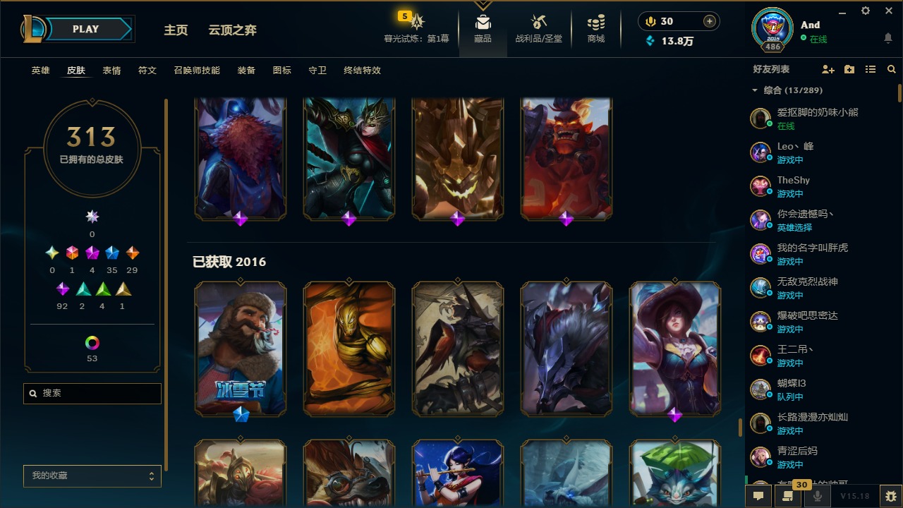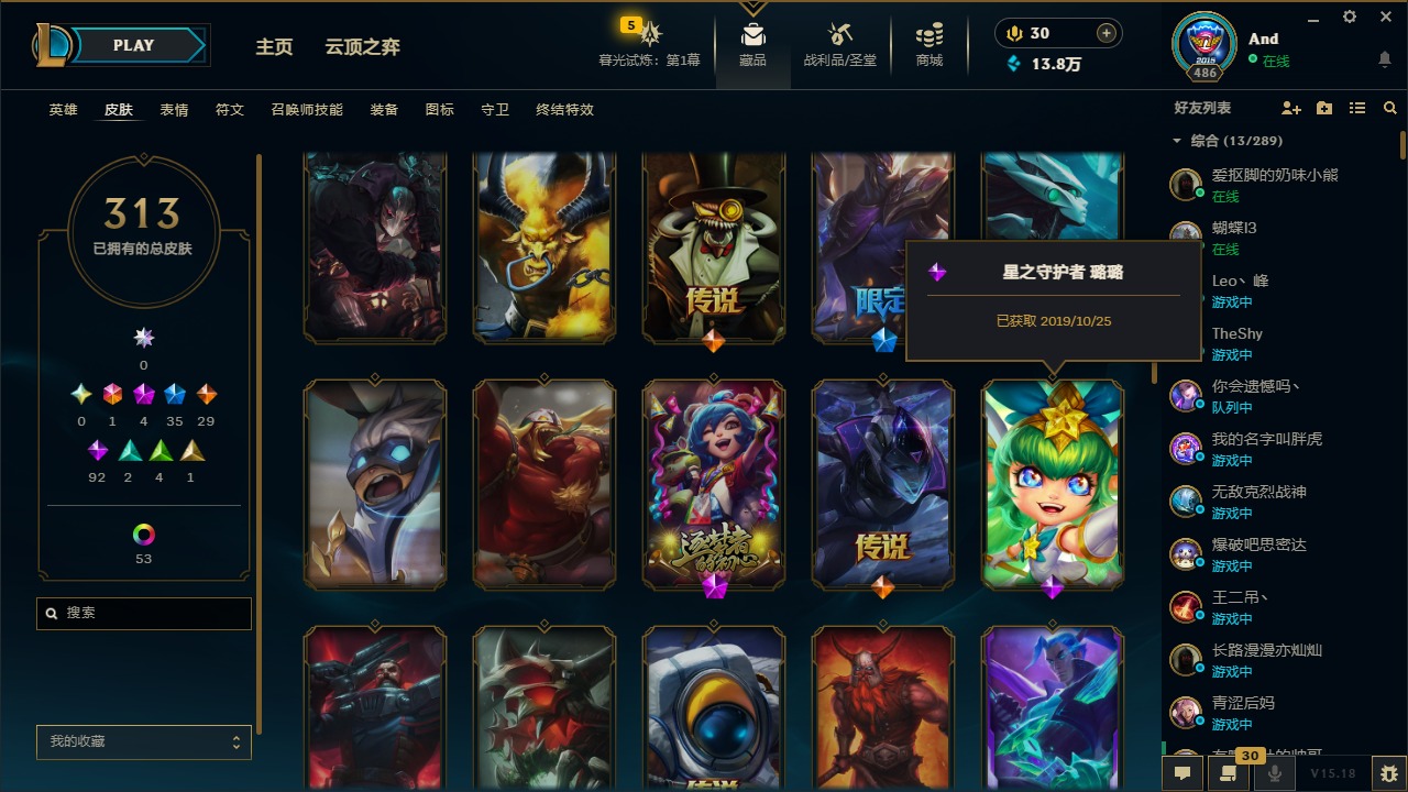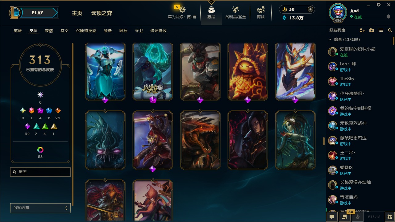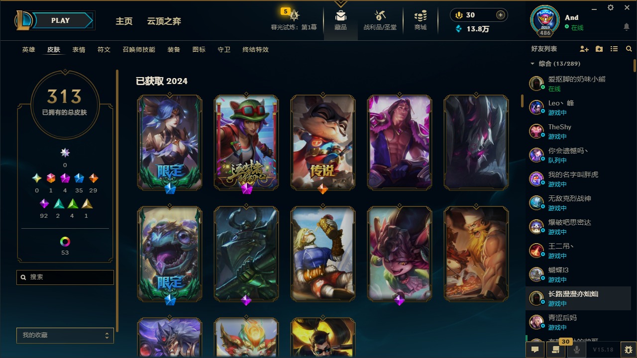 [12077292]1终极 4神话 35限定 29传说 92史诗 313皮肤 58炫彩 可二次 可修改实名 优质装备:源代码 乐芙兰,防爆天使 凯尔,暗影 沃里克,都铎王朝 图奇,红桃杰克 崔斯特,蒙多蒙多,密林猎手 提莫,御魔星矢 寒冰,未来战士,冠军之箭 艾希 凯旋圣装,无畏骑士 瑟庄妮 赤子初心,十五周年纪念 希维尔,暗裔英雄 盖伦 海克斯:海克斯 嘉文四世 限定:钢铁军团 拉克丝 赛季限定皮:胜利凤凰 艾尼维亚,胜利之运 崔斯特,胜利剑圣 易,胜利女神 娑娜,胜利巨口 克格莫,胜利之王 泰达米尔,胜利之剑 剑魔 冠军限定系列:S1FNC 迦娜,S2 暗杀星 努努,S4 SSW 图奇,S5 SKT T1 阿利斯塔,S11 EDG 佛耶戈 冰雪节限定:“主人不要我了” 阿木木,冰雪节 格雷福斯,平安夜女神 娑娜,魄罗骑士 瑟庄妮,圣诞开心鬼 提莫,圣诞老人 酒桶,雪默丁格,英勇玩具兵船长 泳池派对:泳池派对 雷克顿,泳池派对 李青,海之歌 萨勒芬妮 万圣节限定:南瓜头 费德提克 年限:天龙之子 斯莫德,马年 黛安娜 周年:10周年 安妮