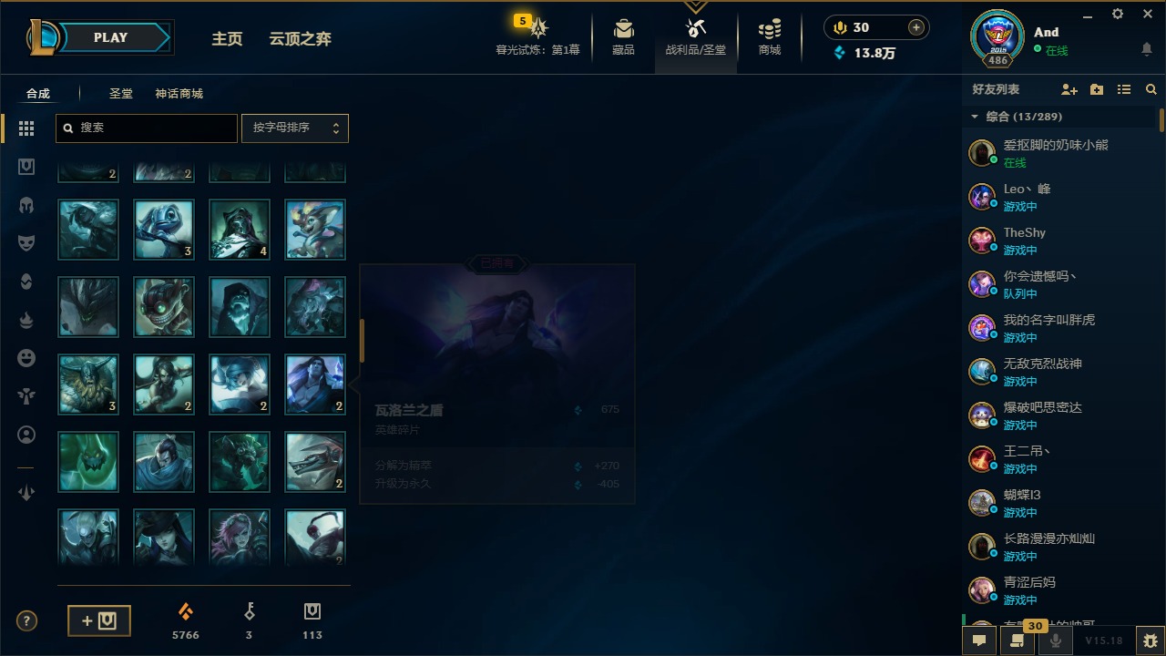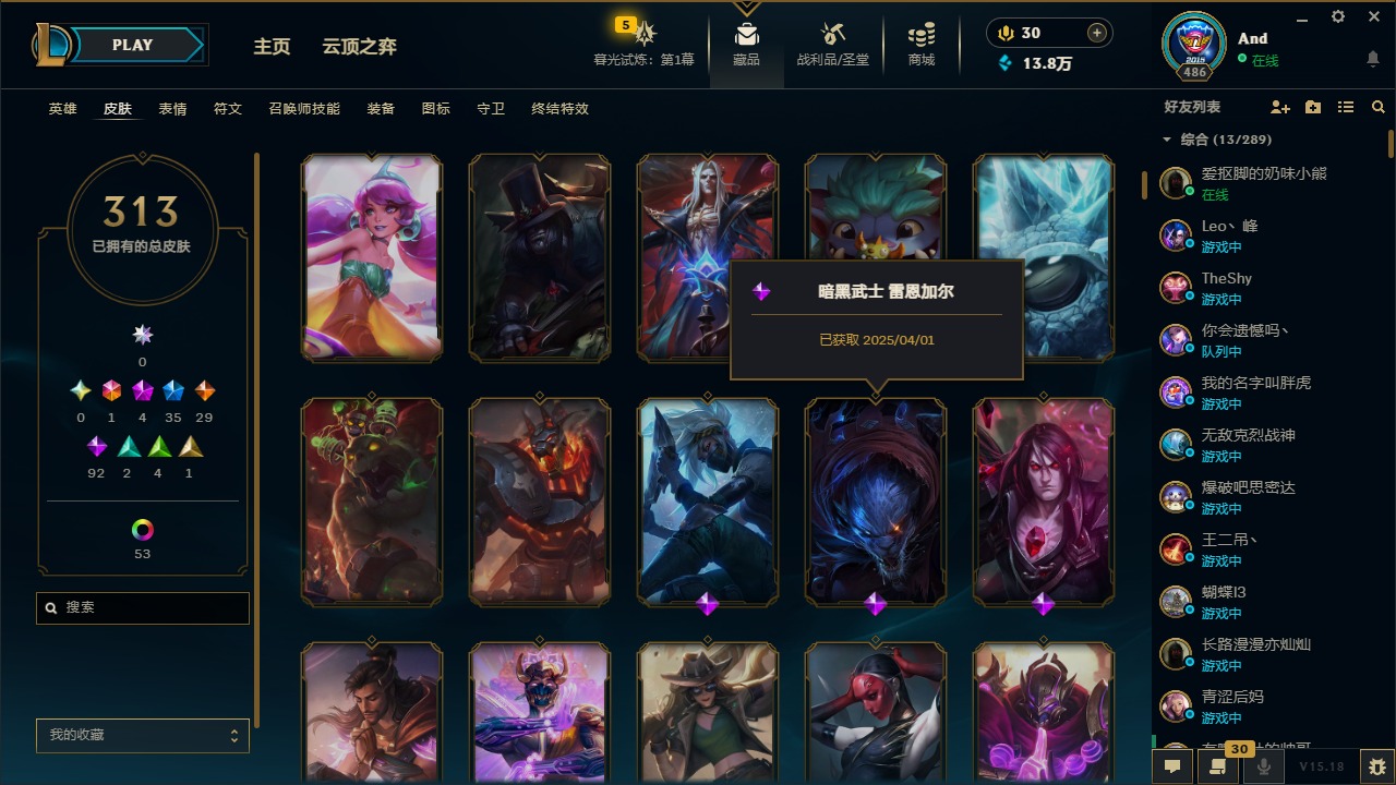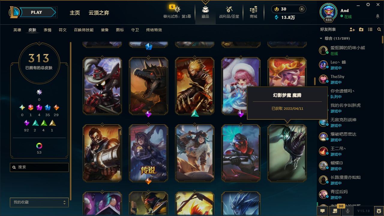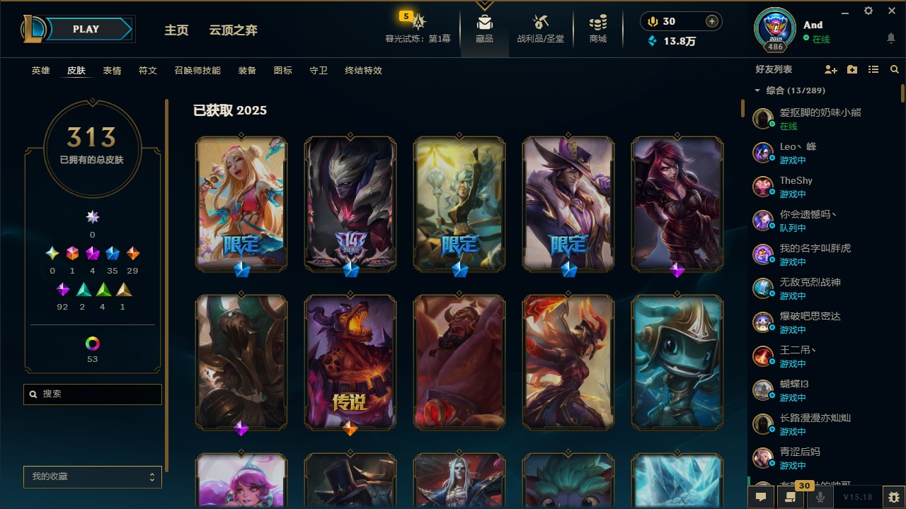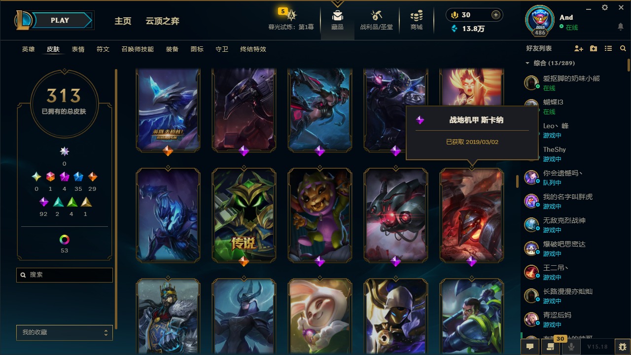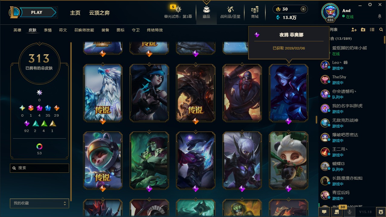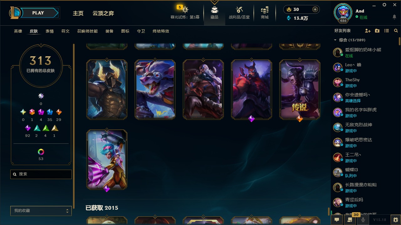 [12077292]1终极 4神话 35限定 29传说 92史诗 313皮肤 58炫彩 可二次 可修改实名 优质装备:源代码 乐芙兰,防爆天使 凯尔,暗影 沃里克,都铎王朝 图奇,红桃杰克 崔斯特,蒙多蒙多,密林猎手 提莫,御魔星矢 寒冰,未来战士,冠军之箭 艾希 凯旋圣装,无畏骑士 瑟庄妮 赤子初心,十五周年纪念 希维尔,暗裔英雄 盖伦 海克斯:海克斯 嘉文四世 限定:钢铁军团 拉克丝 赛季限定皮:胜利凤凰 艾尼维亚,胜利之运 崔斯特,胜利剑圣 易,胜利女神 娑娜,胜利巨口 克格莫,胜利之王 泰达米尔,胜利之剑 剑魔 冠军限定系列:S1FNC 迦娜,S2 暗杀星 努努,S4 SSW 图奇,S5 SKT T1 阿利斯塔,S11 EDG 佛耶戈 冰雪节限定:“主人不要我了” 阿木木,冰雪节 格雷福斯,平安夜女神 娑娜,魄罗骑士 瑟庄妮,圣诞开心鬼 提莫,圣诞老人 酒桶,雪默丁格,英勇玩具兵船长 泳池派对:泳池派对 雷克顿,泳池派对 李青,海之歌 萨勒芬妮 万圣节限定:南瓜头 费德提克 年限:天龙之子 斯莫德,马年 黛安娜 周年:10周年 安妮