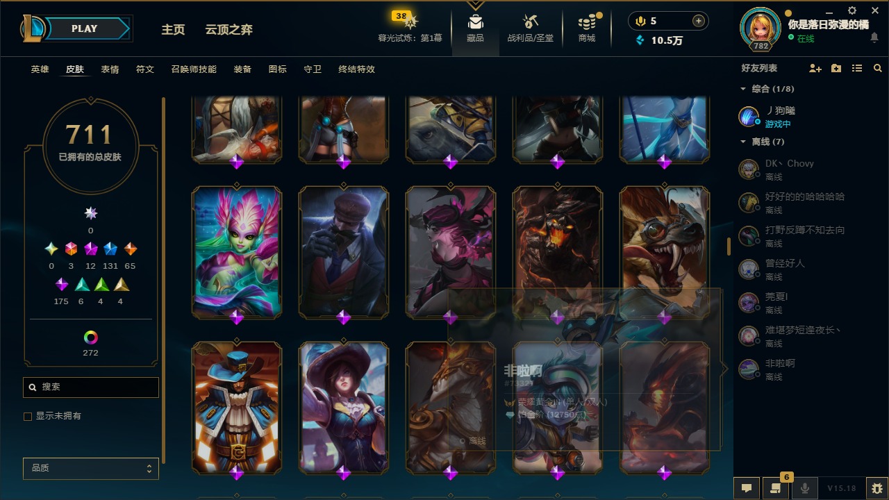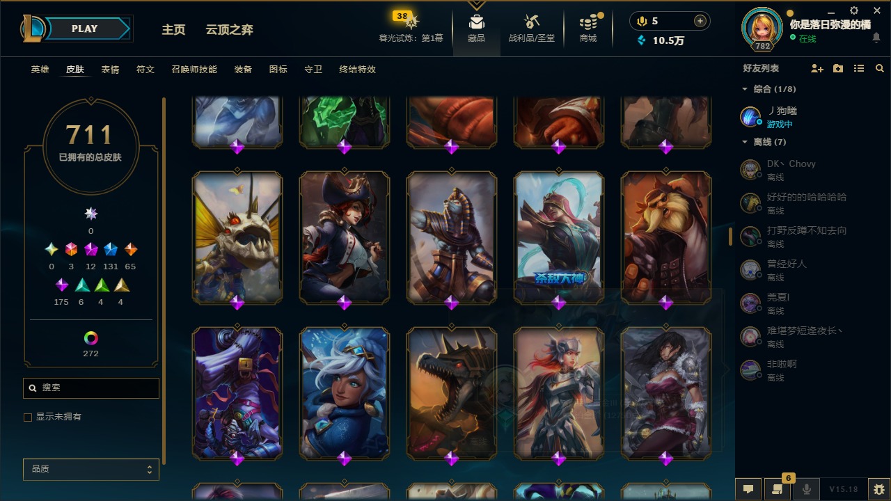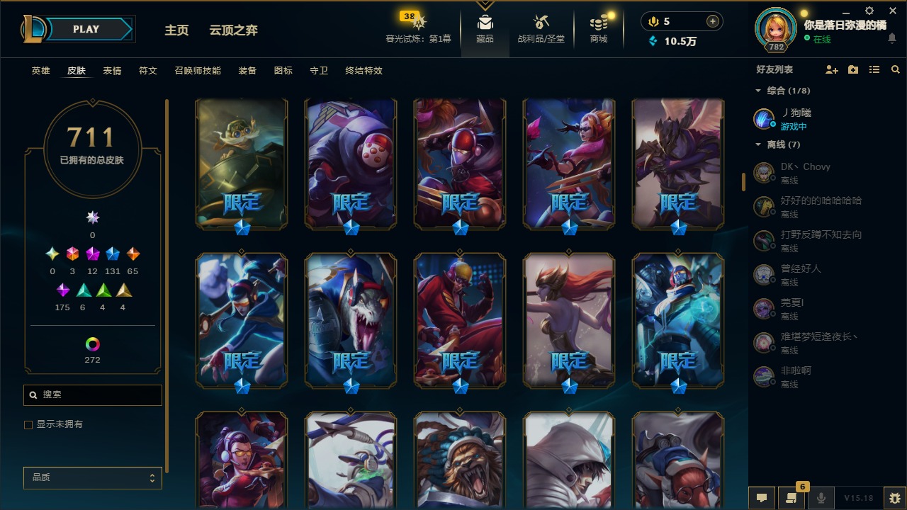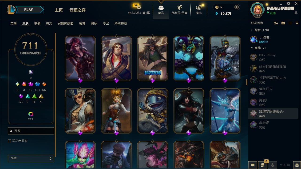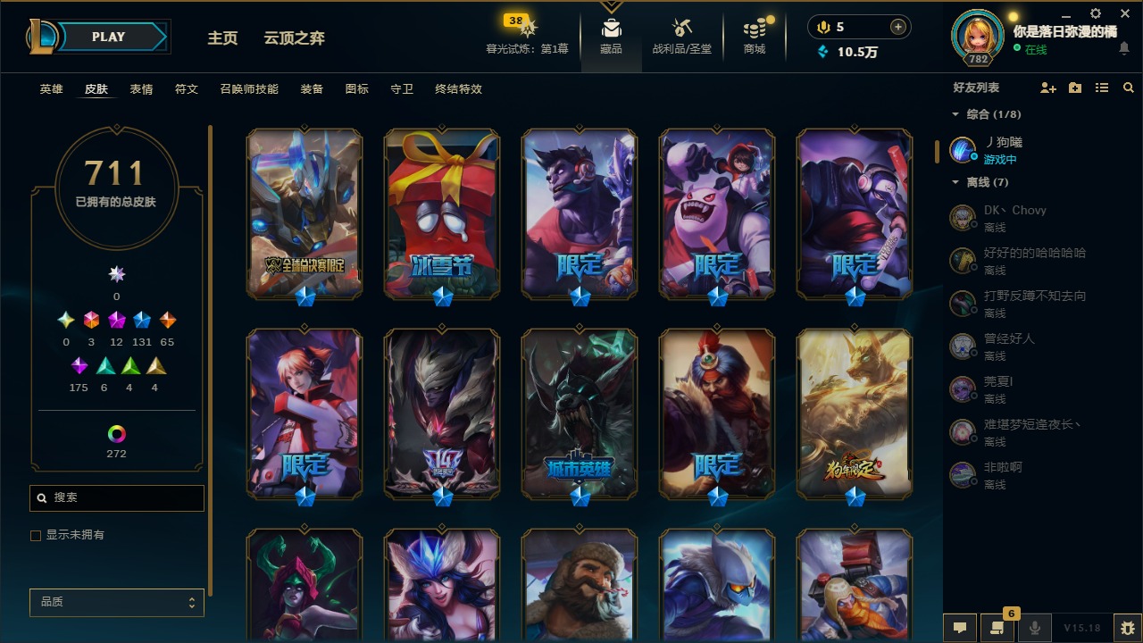 - [12173849]2终极 20神话 115限定 60传说 145史诗 692皮肤 218炫彩 171英雄 可二次 可修改实名 优质装备:至臻 腥红之月 亚托克斯,至臻 战斗学院 拉克丝,至臻 真实伤害 赛娜,至臻 魔女 婕拉,至臻 神龙尊者 炎龙瑟提,至臻 真实伤害 亚索,至臻 魅惑女巫 莫甘娜,至臻 神龙尊者均衡之龙 沃利贝尔,养蜂人 辛吉德,源代码 乐芙兰,暗影 沃里克,巧克力工坊 波比,都铎王朝 图奇,防爆机器人 布里茨,钢铁之翼 凤凰,冠军之箭 艾希,冠军之刃 锐雯 2016,冠军之血 希瓦娜,鸡里奥,警用试作体K-9 内瑟斯,蓝色忧郁 崔斯特,密林猎手 提莫,破空枪骑 孙悟空,送披萨的小姐姐 希维尔,糖果使徒 费德提克,野兽猎人 瑟庄妮,野兽猎人 泰达米尔,勇者 阿狸,勇者 奈德丽,制胜金球 拉莫斯,灰烬骑士 派克,大元素使,DJ-娑娜,冠军之箭 艾希 凯旋圣装,雾雨之刃 锐雯,冠军之刃 锐雯 2016 凯旋圣装,偶像歌手 阿理 极地雪莲,无畏骑士 瑟庄妮 赤子初心,闭月之颜 貂蝉 炫金莲华,至臻 腥红之月 亚托克斯(2022),至臻 战斗学院 拉克丝(2022),咖啡甜心 金克丝 核桃巴菲,净雪之月 莫甘娜 冬虹,银龙裁夬 泰隆 潜龙在渊,墨之影武者 亚索 金墨耀影,暗星 科加斯,心之钢 伊泽瑞尔 天纵才华,魔女 阿卡丽 虚荣,幻灵战斗兔 阿萝拉 梦幻强袭,魅影之刃 锐雯,暗裔英雄 盖伦 海克斯:海克斯 玛尔扎哈,海克斯 雷克顿,海克斯 波比,海克斯 瑟庄妮 限定:星之守护者 芮尔,双城之战2 孤勇者 艾克,生化领主 泰达米尔 情人节限定:觅心女王 寒冰,甜心宝贝 安妮,甜心之翎 洛,幽梦玫瑰 球女 赛季限定皮:胜利之运 崔斯特,胜利剑圣 易,胜利女神 娑娜 冠军限定系列:S1FNC 酒桶,S1FNC 迦娜,S1FNC 嘉文四世,S1FNC 卡尔萨斯,S2 暗杀星 蒙多,S2 暗杀星 努努,S2 暗杀星 伊泽瑞尔,S3 SKT T1 贾克斯,S3 SKT T1 薇恩,S3 SKT T1 婕拉,S4 SSW 锤石,S4 SSW 雷恩加尔,S4 SSW 泰隆,S4 SSW 图奇,S4 SSW 炼金,S5 SKT T1 雷克顿,S5 SKT T1 瑞兹,S5 SKT T1 阿兹尔,S6 SKT T1 球女,S7 SSG 嘉文四世,S7 SSG 纳尔,S7 SSG 霞,S8 I
