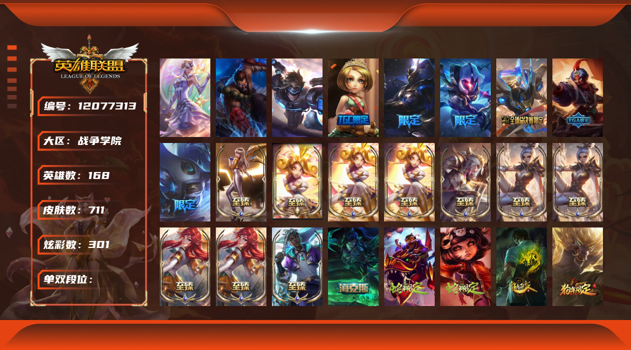 [12077313]3终极 12神话 131限定 65传说 175史诗 711皮肤 301炫彩 168英雄 可二次 可修改实名 优质装备:至臻 玉剑传说 武剑仙,至臻 战斗学院 拉克丝,至臻 K/DA 卡莎,至臻 星之守护者 妮寇,至臻 女帝 黛安娜,穿星魔锋,斩星魔剑,防爆天使 凯尔,暗影 沃里克,巧克力工坊 波比,创世纪 希维尔,地底世界 崔斯特,电玩战魂 人马,都铎王朝 图奇,防爆士兵 炼金,防爆士兵 格雷福斯,钢铁之翼 凤凰,冠军典狱长 锤石,冠军掠夺者 卡兹克,冠军之箭 艾希,冠军之矛 滑板鞋,冠军之刃 锐雯,冠军之刃 锐雯 2016,冠军之隐 劫,警用试作体K-9 内瑟斯,密林猎手 提莫,诺斯费拉图 弗拉基米尔,野兽猎人 德莱文,野兽猎人 瑟庄妮,野兽猎人 泰达米尔,勇者 阿狸,御魔星矢 寒冰,战场BOSS 吉格斯,至臻 星之守护者 艾克,大元素使,灵魂守卫,未来战士,2022 全球总决赛 阿兹尔,至臻 星之守护者 妮蔻,雾雨之刃 锐雯,冠军之刃 锐雯 2016 凯旋圣装,冠军掠夺者 卡兹克 凯旋圣装,弹幕天使 卡莎 炽天使·公正,冠军之血 希瓦娜 凯旋圣装,无畏骑士 瑟庄妮 赤子初心,外星装甲 库奇,星之守护者 金克丝 黑洞,冠军之隐 劫 凯旋圣装,至臻 星之守护者 妮蔻(2022),至臻 玉剑传说 武剑仙(2022),至臻 战斗学院 拉克丝(2022),净雪之月 莫甘娜 冬虹,银龙裁夬 泰隆 潜龙在渊,墨之影武者 亚索 金墨耀影,战斗学院 盖伦 不死鸟,十五周年纪念 希维尔,心之钢 伊泽瑞尔 天纵才华,魔女 阿卡丽 虚荣,北极星钢影 卡蜜尔 智慧纽带,幻灵战斗兔 阿萝拉 梦幻强袭,魅影之刃 锐雯,暗裔英雄 盖伦 海克斯:摄魂 薇恩 限定:奥斯曼大帝 普朗克,创星之灵 璐璐,舞会公主 安妮 情人节限定:觅心猎手 薇恩,觅心魔灵 奥利安娜,觅心女王 寒冰,甜心之翎 洛,甜心之羽 霞 赛季限定皮:胜利凤凰 艾尼维亚,胜利剑圣 易,胜利女神 娑娜,胜利巨口 克格莫,胜利之王 泰达米尔,胜利女神 莫甘娜,胜利女神 希维尔,胜利之树 茂凯,胜利之剑 剑魔,胜利枪神 卢锡安,胜利女神 瑟庄妮 冠军限定系列:S13 T1 李青,S1FNC 酒桶,S1FNC 迦娜,S1FNC 嘉文四世,S1FNC 卡尔萨斯,S1FNC 库奇,S2 暗杀星 蒙多,S2 暗杀星 努努,S2 暗杀星 慎,S