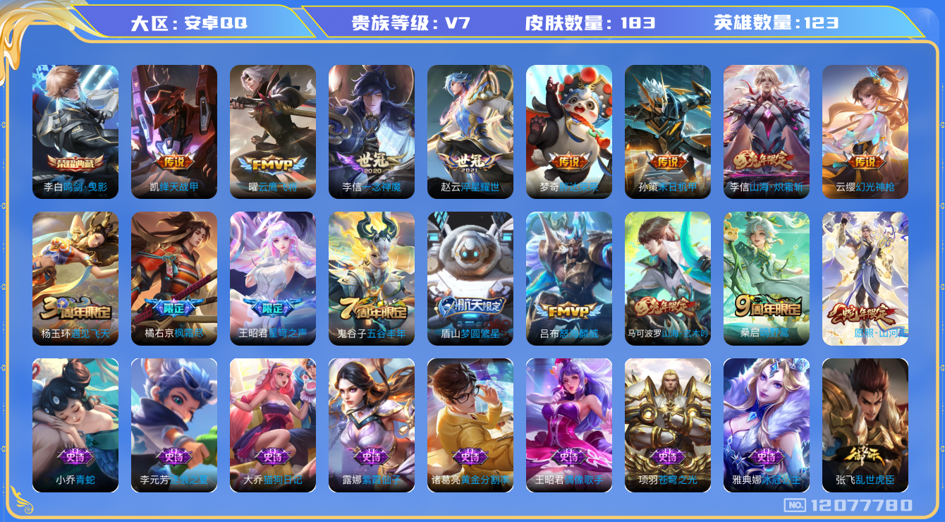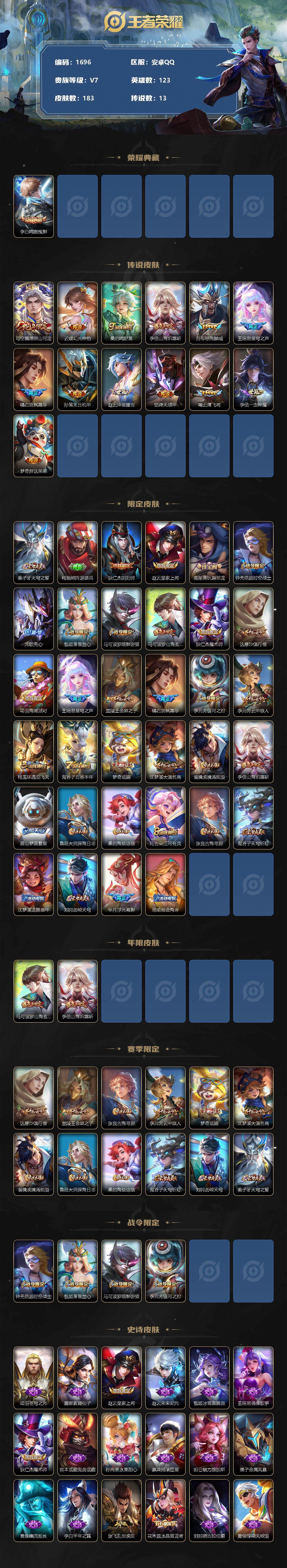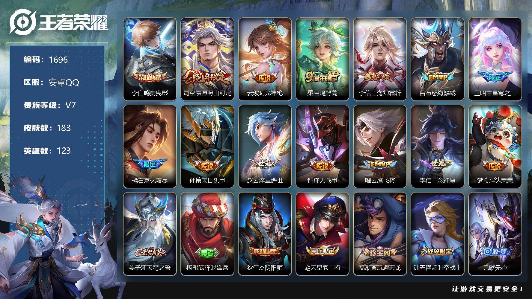 [12077780]【商品标题】:安卓Q-V7-永恒钻石III段位-123英雄-183皮肤-1典藏-0珍品无双-0无双-0珍品传说-13传说-55史诗