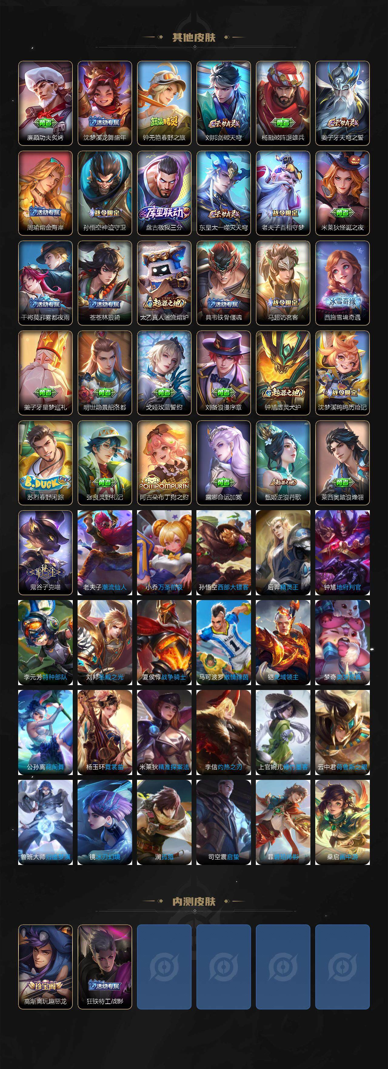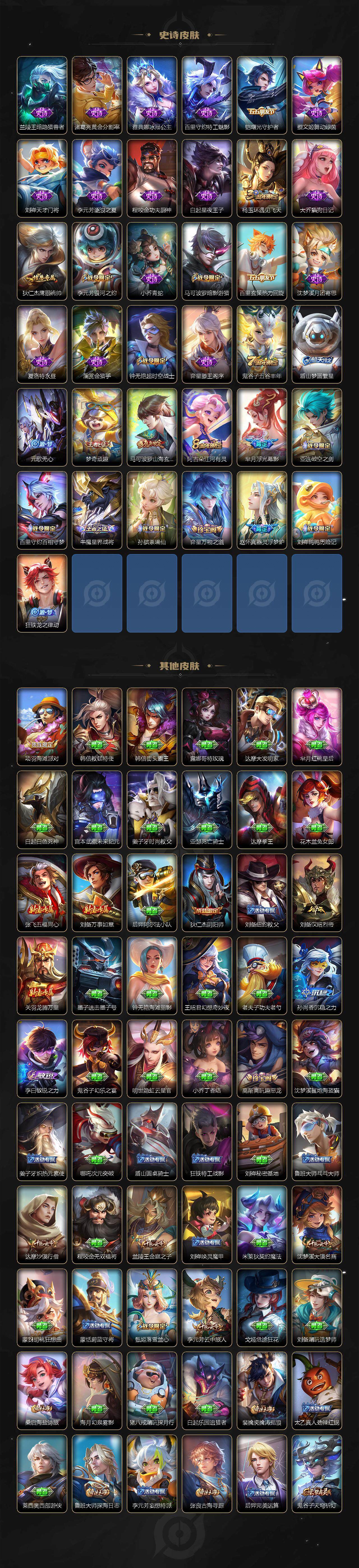 【史诗皮肤】:项羽苍穹之光,露娜紫霞仙子,赵云皇家上将,赵云未来纪元,甄姬冰雪圆舞曲,王昭君偶像歌手,狄仁杰魔术师,宫本武藏鬼剑武藏,孙尚香水果甜心,嬴政摇滚巨星,妲己魅力维加斯,墨子金属风暴,曹操幽灵船长,李白千年之狐,张飞乱世虎臣,花木兰水晶猎龙者,刘邦德古拉伯爵,夏侯惇乘风破浪,兰陵王暗隐猎兽者,诸葛亮黄金分割率,雅典娜冰冠公主,百里守约特工魅影,铠曙光守护者,蔡文姬舞动绿茵,刘禅天才门将,李元芳逐浪之夏,程咬金功夫厨神,白起星夜王子,杨玉环遇见飞天,大乔猫狗日记,狄仁杰鹰眼统帅,李元芳银河之约,小乔青蛇,马可波罗暗影游猎,百里玄策热力回旋,沈梦溪月团寄思,夏洛特永昼,澜赏金猎手,钟无艳超时空战士,弈星滕王阁序,鬼谷子五谷丰年,盾山梦圆繁星,元歌无心,梦奇顽趣,马可波罗山海玄木吟,阿古朵江河有灵,芈月浮光幕影,亚连破空之剑,百里守约百相守梦,牛魔星界战将,孙膑茶境仙,弈