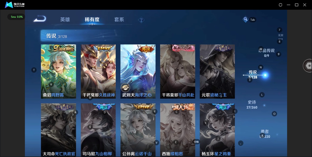 - [11517910]V5 6传说 103英雄 94皮肤 可修改实名 优质装备:地狱之眼,记忆之芯(机甲兔) 传说皮:云诺千山 珍宝阁皮:蔷薇恋人 限定皮:愿照·九州拓(澜年限),愿照·山河定(司空震年限),鸣野蒿,李小龙 史诗皮:器灵·浮梦炉,糖绘人间,星界战将,紫霞仙子,千年之狐,偶像歌手,末日机甲-吕布,猫狗日记-大乔,女仆咖啡,水果甜心,功夫厨神,鬼剑武藏,纤云弄巧,逐浪之夏,水晶猎龙者,鹰眼统帅