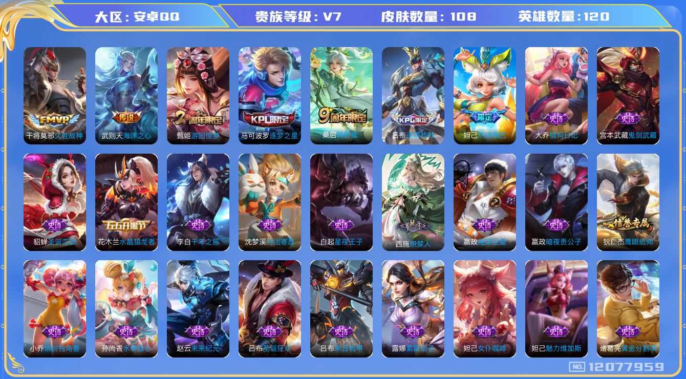 [12077959]V7 3传说 120英雄 108皮肤 典藏英雄武则天 可修改实名 优质装备:久胜战神,海洋之心 限定皮:逐霄战戟,鸣野蒿,游园惊梦,逐梦之星,热情桑巴 史诗皮:织梦人,紫霞仙子,黄金分割率,千年之狐,偶像歌手,末日机甲-吕布,猫狗日记-大乔,女仆咖啡,摇滚巨星,水果甜心,星夜王子,鬼剑武藏,缤纷独角兽,月团寄思,水晶猎龙者,圣诞狂欢,圣诞恋歌,鹰眼统帅,暗夜贵公子,魅力维加斯,未来纪元-赵云