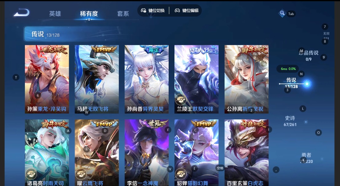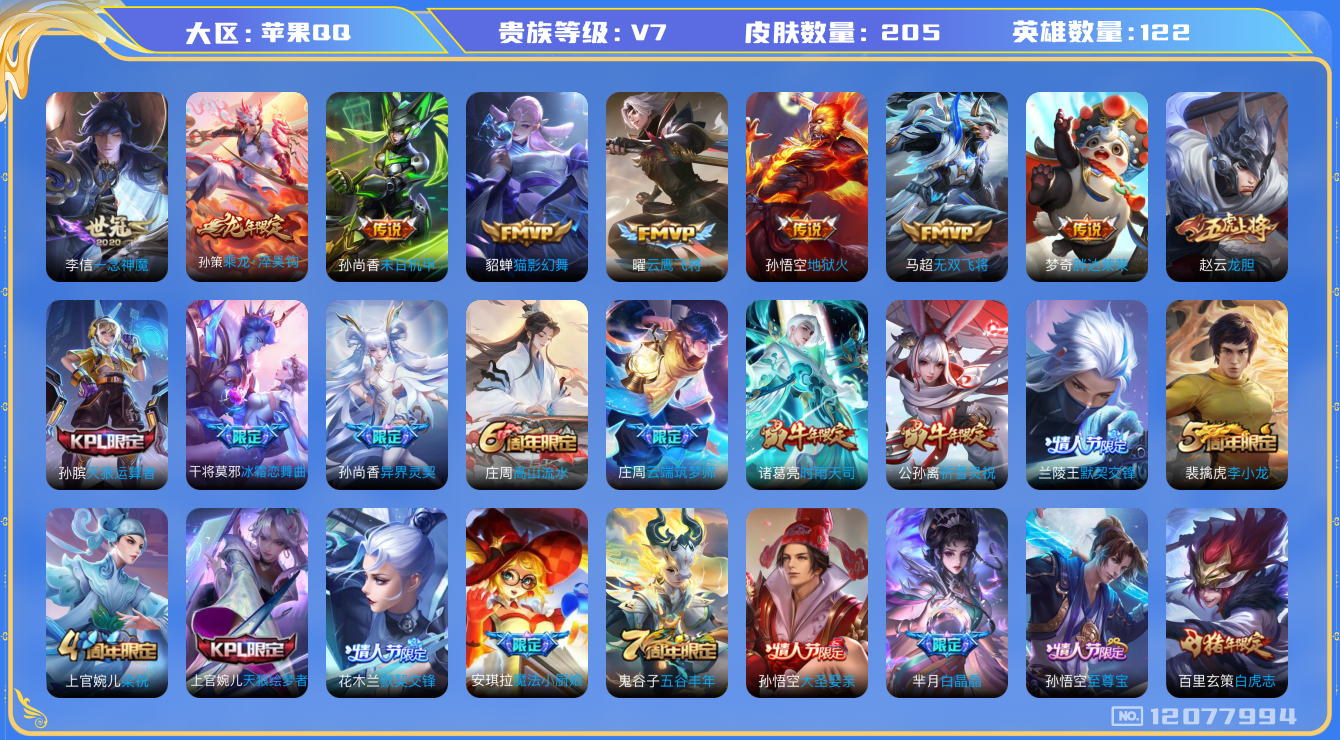 - [11867766]V7 5传说 120英雄 157皮肤 可修改实名 优质装备:久胜战神 珍宝阁皮:妄想食味 限定皮:愿照·千秋盛(女娲年限),鸣野蒿,至尊宝,白虎志(电光耗子),凤求凰(白切鸡),神威(电光马子),五谷丰年,梁祝,李小龙,如梦令-后羿 史诗皮:化蝶舞,星界战将,百相守梦-黄忠,紫霞仙子,电玩小子(小书包),白龙吟,黄金分割率,特工魅影,魅语,冰冠公主,猫狗日记-孙策,时之恋人-孙尚香,节奏热浪,水果甜心,星夜王子,德古拉伯爵,幽灵船长,鬼剑武藏,纤云弄巧,繁星吟游(呼啦呼啦),缤纷独角兽,乘风破浪,逐浪之夏,水晶猎龙者,曙光守护者,箭羽风息,金属风暴,原初追逐者,圣诞狂欢,圣诞恋歌,鹰眼统帅,暗夜贵公子,魅力维加斯,黎明之约