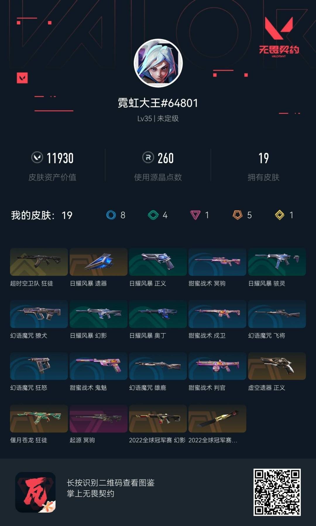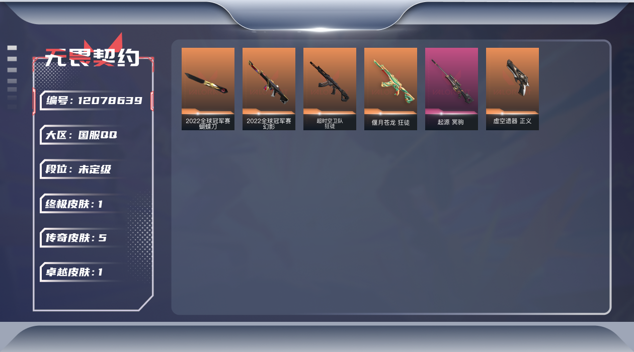 [12078639]5橙皮 1金皮 1紫皮 19皮肤 11英雄 25卡面 260已用源晶 未定级 优质装备:狂徒-偃月苍龙,冥驹-起源 亮点皮肤:幻影-2022全球冠军赛,2022全球冠军赛 蝴蝶刀 套装:2022全球冠军赛 佩枪皮肤:正义-虚空遗器 步枪皮肤:狂徒-超时空卫队