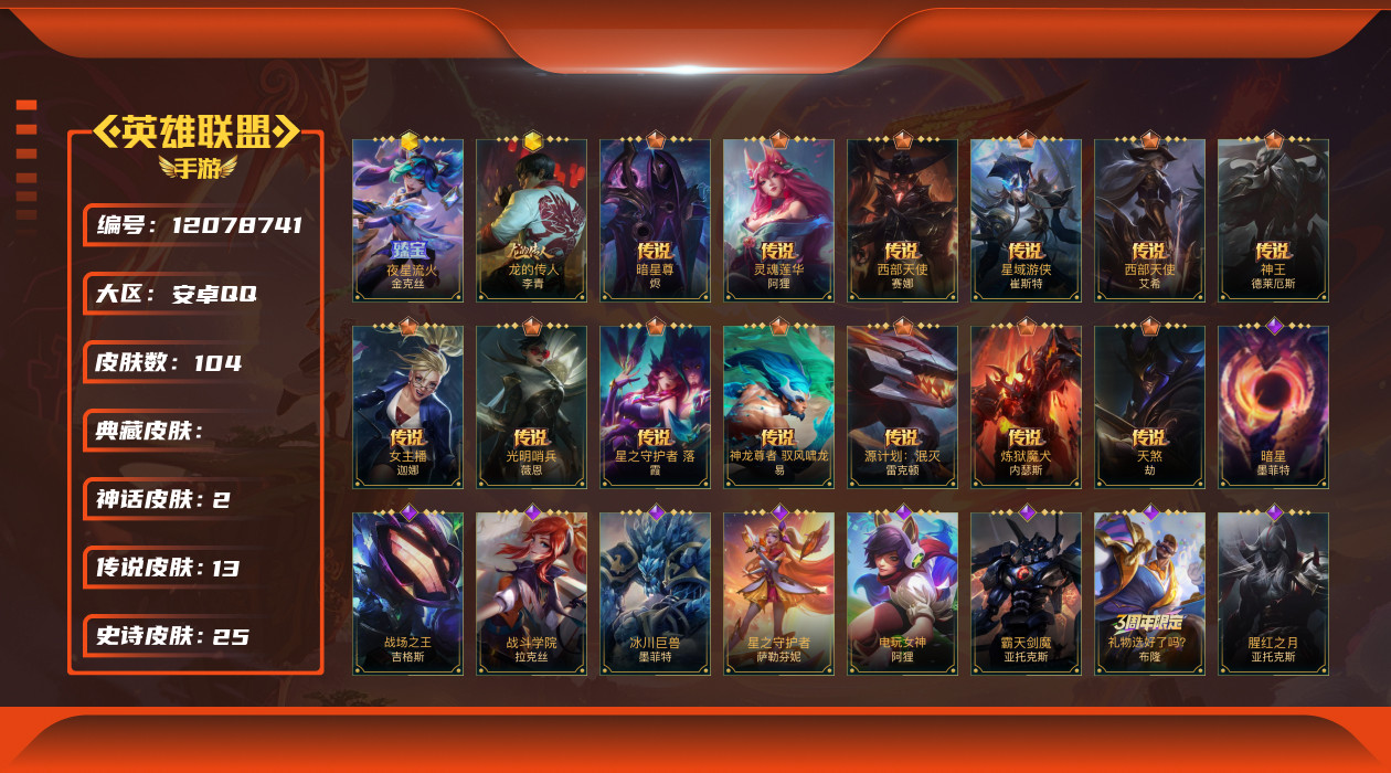 [12078741]13传说 25史诗 104皮肤 可二次 可修改实名 优质装备:暗星尊,光明哨兵薇恩,炼狱魔犬,女主播风女,神龙尊者 驭风啸龙,神王诺手,天煞劫,西部天使寒冰,西部天使赛娜,星域游侠卡牌,星之守护者 落,玉剑传说 武剑仙,源计划:泯灭,龙的传人,灵魂莲华阿狸,龙的传人 段位:翡翠 神话皮:夜星流火 金克丝 限定皮肤:星之守护者霞,星之守护者洛 亮点:暗星尊,光明哨兵薇恩,炼狱魔犬,女主播风女,神龙尊者 驭风啸龙,神王诺手,天煞劫,西部天使寒冰,西部天使赛娜,星域游侠卡牌,星之守护者 落,玉剑传说 武剑仙,源计划:泯灭,龙的传人,灵魂莲华阿狸,龙的传人