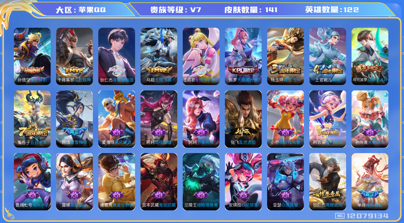 - [12245090]V7 1典藏 1珍品传说 7传说 125英雄 300皮肤 可修改实名 优质装备:鸣剑·曳影,怪盗基德,云鹰飞将(小将军),超时空战士-狄仁杰,涂山容容 传说皮:幻光神枪 珍宝阁皮:妄想食味,优雅恋人,女武神 限定皮:愿照·岁时盈(虞姬年限),鸣野蒿,白虎志(电光耗子),傲雪梅枪,时雨天司(水龙头),神威(电光马子),遇见飞天,高山流水,五谷丰年,游园惊梦,梁祝,奔雷神使(牛魔年限),李小龙,孙行者,大圣娶亲,青春决赛季,冰霜恋舞曲,神奇女侠,匿光追影者,寅虎·御盾(廉颇年限),玉兔公主 史诗皮:器灵·浮梦炉,星界战将,蒙犽顽岩魄,百相守梦-百里守约,紫霞仙子,苍穹之光,电玩小子(小书包),白龙吟,黄金分割率,特工魅影,千年之狐,永昼,江河有灵,雪夜绮愿(周瑜),蒙恬荣光圣徽,无限星赏官,冰冠公主,偶像歌手,晚萤,电玩·爆裂旋风,猫狗日记-孙策,时之恋人-孙尚香,乱世虎臣,女仆咖啡,摇滚巨星,水果甜心,绅士熊喵,天才门将,星夜王子,心灵骇客,功夫厨神,德古拉伯爵,暗隐猎兽者,幽灵船长,鬼剑武藏,心灵战警,天秀·启明,舞动绿茵,地狱岩魂,诗语江南,纤云弄巧,拒霜思,缤纷独角兽,乘风破浪,逐浪之夏,水晶猎龙者,曙光守护者,箭羽风息,金属风暴,原初追逐者,圣诞狂欢,圣诞恋歌,鹰眼统帅,暗夜贵公子,黎明之约,赏金猎手,寅虎·御盾,无心,未来纪元-赵云