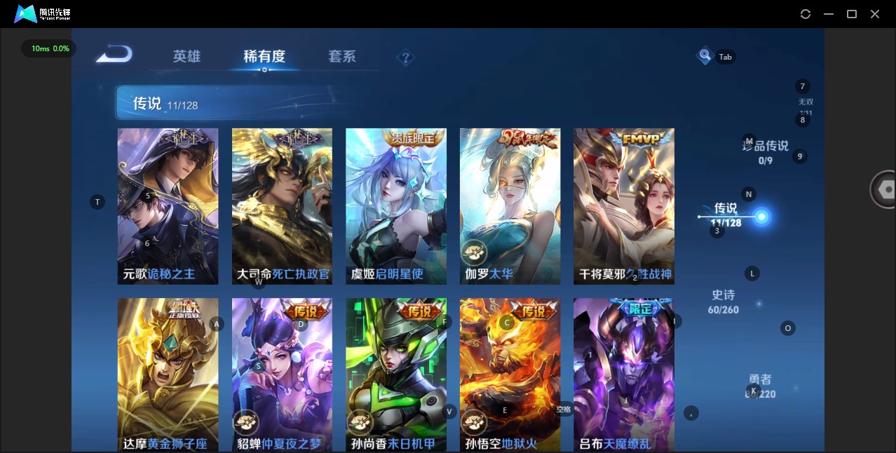 - PX_2094661-60 安卓QQ/永恒钻石/323皮肤/124英雄/0典藏/0珍品无双/2无双/0珍品传说/22传说/86史诗/8稀有英雄 【2 无双皮肤】时之魔女 小乔,器灵·螭龙剑 曜, 【22 传说皮肤】启明星使 虞姬,零号·赤焰 孙悟空,云鹰飞将 曜,惊梅引 宫本武藏,炽阳神光 镜,黄金射手座 后羿,遇见神鼓 吕布,寅虎·瑞焰 鲁班七号,时之恋人 刘备,乘龙·淬吴钩 孙策,山海·炽霜斩