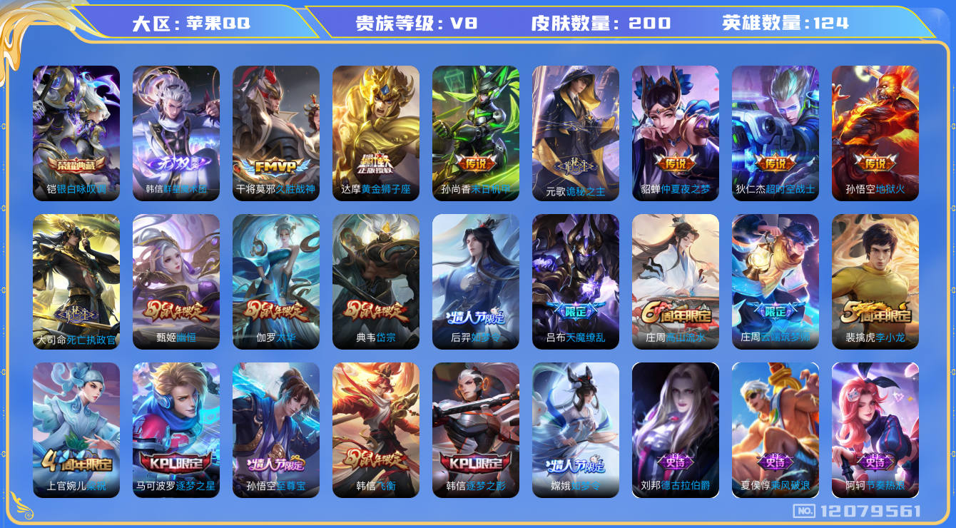[12079561]V8 1典藏 1无双 11传说 124英雄 200皮肤 可修改实名 优质装备:银白咏叹调(倪克斯侍卫),韩信群星魔术团(韩信无双),黄金狮子座,久胜战神,末日机甲-孙尚香(绿蚂蚱),地狱火,仲夏夜之梦(大飞蛾),超时空战士-狄仁杰,诡秘之主 传说皮:死亡执政官 珍宝阁皮:妄想食味 限定皮:至尊宝,太华(伽罗年限),飞衡(韩信年限),高山流水,幽恒(沐浴露),梁祝,逐梦之星,岱宗(典韦年限),李小龙,逐梦之影,如梦令-嫦娥,如梦令-后羿,天魔缭乱,云端筑梦师 史诗皮:灵蛊蚀心,百相守梦-周瑜,百相守梦-黄忠,紫霞仙子,电玩小子(小书包),白龙吟,黄金分割率,特工魅影,千年之狐,江河有灵,魅语,偶像歌手,末日机甲-吕布,乱世虎臣,节奏热浪,摇滚巨星,天才门将,星夜王子,功夫厨神,德古拉伯爵,暗隐猎兽者,幽灵船长,鬼剑武藏,心灵战警,舞动绿茵,地狱岩魂,纤云弄巧,繁星吟游(呼啦呼啦),缤纷独角兽,乘风破浪,逐浪之夏,水晶猎龙者,曙光守护者,箭羽风息,原初追逐者,圣诞狂欢,鹰眼统帅,暗夜贵公子,魅力维加斯
