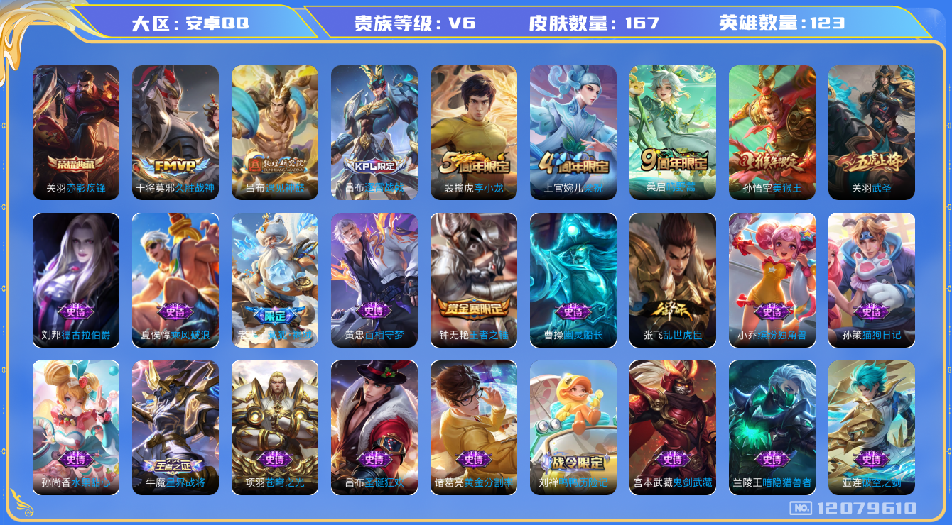 [12079610]V6 1典藏 4传说 123英雄 167皮肤 可修改实名 优质装备:赤影疾锋,久胜战神,遇见神鼓 珍宝阁皮:妄想食味 限定皮:逐霄战戟,鸣野蒿,武圣,梁祝,李小龙,美猴王 史诗皮:鸭鸭历险记-刘禅,龙之律动,星界战将,藏狐·褐绒,百相守梦-黄忠,破空之剑,百相守梦-百里守约,苍穹之光,黄金分割率,千年之狐,冰冠公主,蒙恬荣光圣徽,偶像歌手,百相守梦(关羽),猫狗日记-孙策,乱世虎臣,摇滚巨星,水果甜心,星夜王子,心灵骇客,功夫厨神,德古拉伯爵,暗隐猎兽者,幽灵船长,鬼剑武藏,心灵战警,缤纷独角兽,乘风破浪,水晶猎龙者,原初追逐者,圣诞狂欢,圣诞恋歌,鹰眼统帅,王者之锤,魅力维加斯,黎明之约,未来纪元-赵云