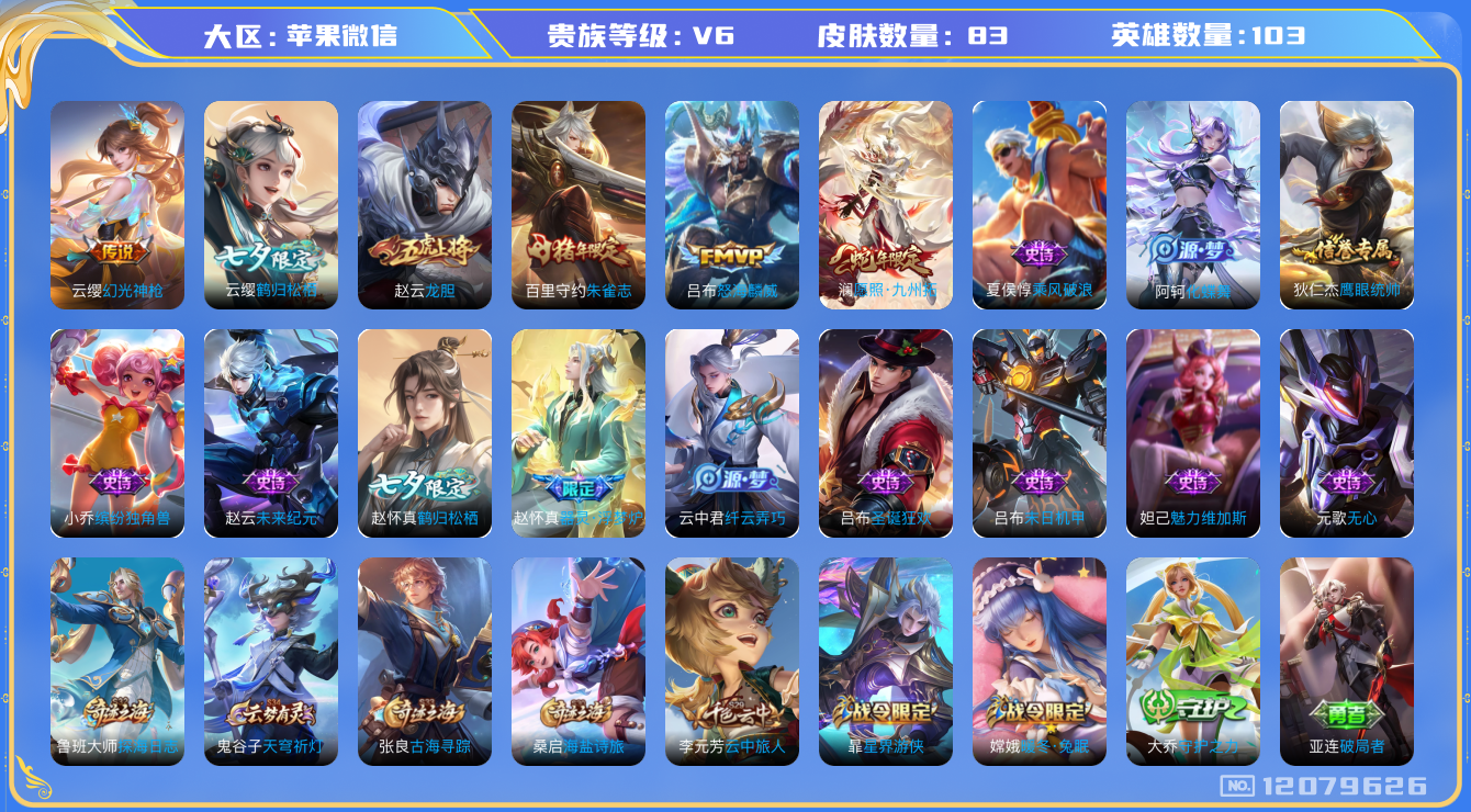 [12079626]V6 4传说 103英雄 83皮肤 可修改实名 所有社交场景限制 优质装备:鹤归松栖(云缨) 传说皮:幻光神枪 限定皮:愿照·九州拓(澜年限),怒海麟威,龙胆,朱雀志(守约年限) 史诗皮:器灵·浮梦炉,化蝶舞,鹤归松栖(赵怀真),末日机甲-吕布,纤云弄巧,缤纷独角兽,乘风破浪,圣诞狂欢,鹰眼统帅,魅力维加斯,无心,未来纪元-赵云