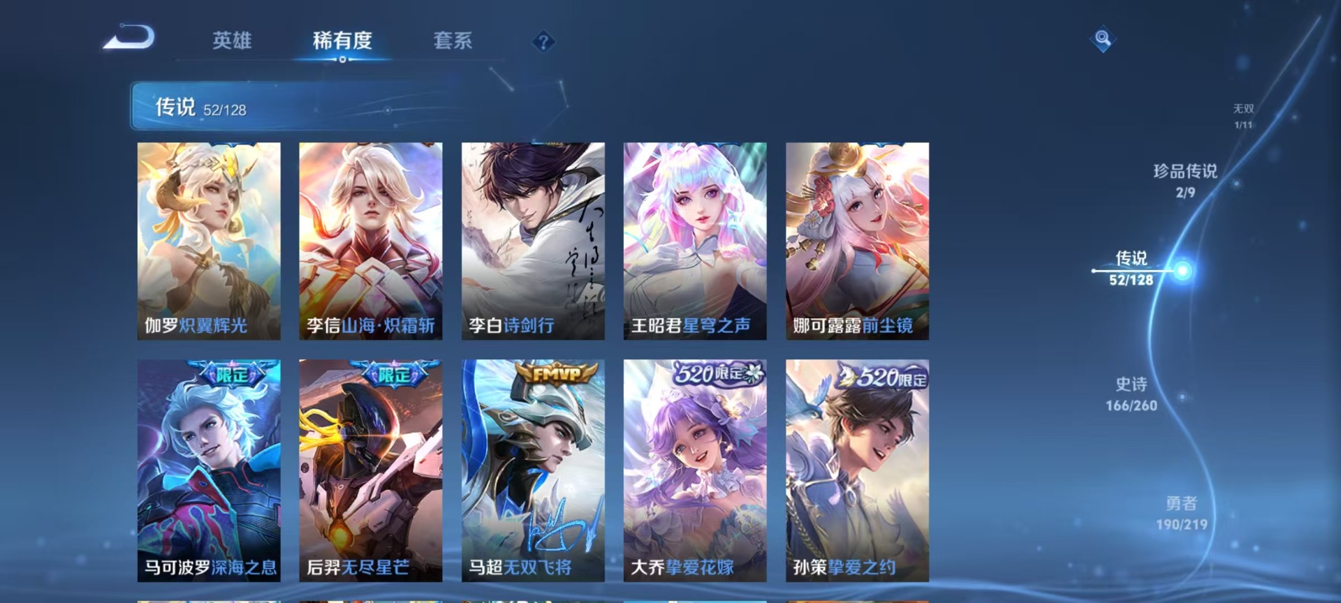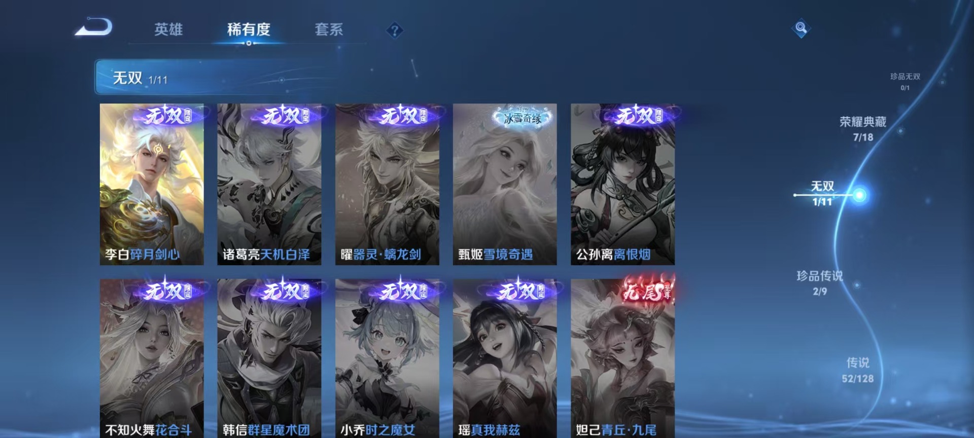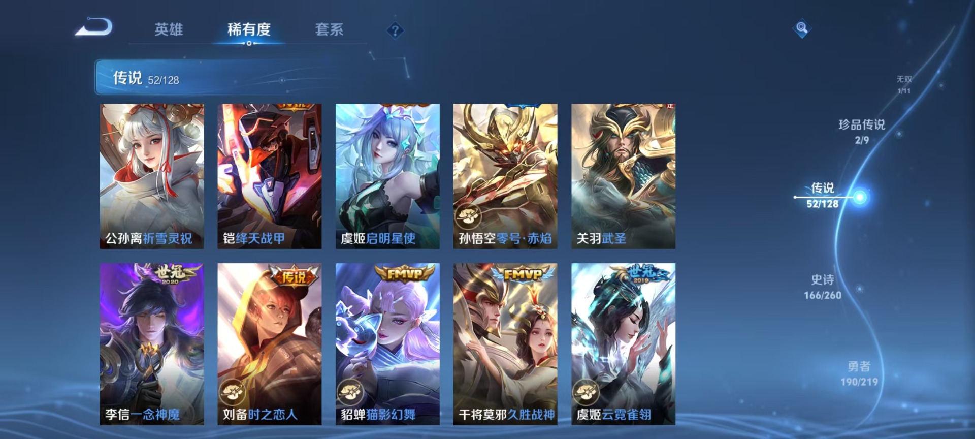 夏侯惇匿光决锋者,夏侯惇霜北刀,老夫子圣诞老人,哪吒逐梦之翼,甄姬幽恒,伽罗天狼溯光者,苏烈玄武志,赵云百木心枪,干将莫邪冰霜恋舞曲,小乔纯白花嫁,典韦岱宗,鲁班七号寅虎·瑞焰,后羿无尽星芒,露娜启示之音,镜匿光追影者,周瑜真爱至上,公孙离祈雪灵祝,裴擒虎李小龙,裴擒虎寅虎·赤拳,上官婉儿梁祝,李白诗剑行,花木兰青春决赛季,安琪拉魔法小厨娘,马可波罗逐梦之星,马可波罗深海之息,桑启鸣野蒿,猪八戒猪悟能,女娲补天,孙悟空大圣娶亲,孙悟空至尊宝,孙悟空美猴王,百里玄策白虎志,韩信傲雪梅枪,韩信飞衡,百里守约朱雀志,蔡文姬奇迹圣诞,墨子降魔,瑶时之祈愿,虞姬愿照·岁时盈,娜可露露前尘镜,妲己热情桑巴,嫦娥如梦令,王昭君星穹之声,关羽武圣,关羽冰锋战神